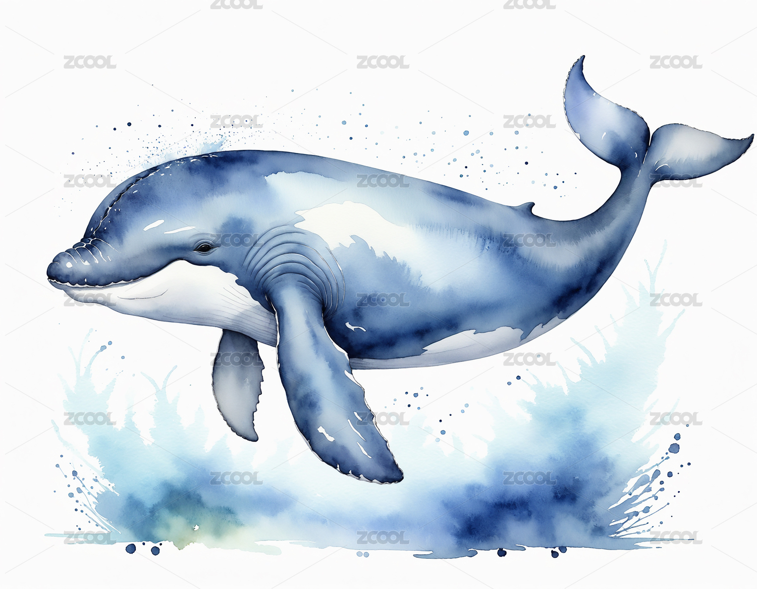 治愈系唯美插画一条蓝色的鲸鱼在遨游