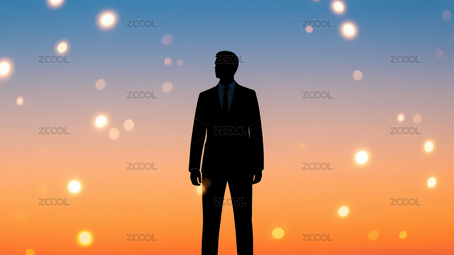 剪影人物蓝橙天空光点