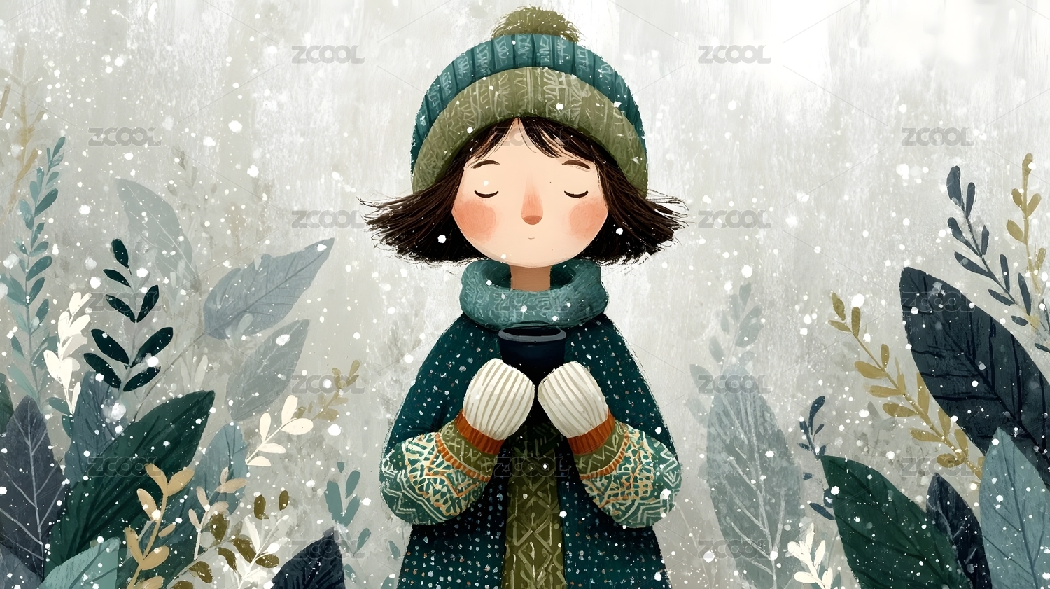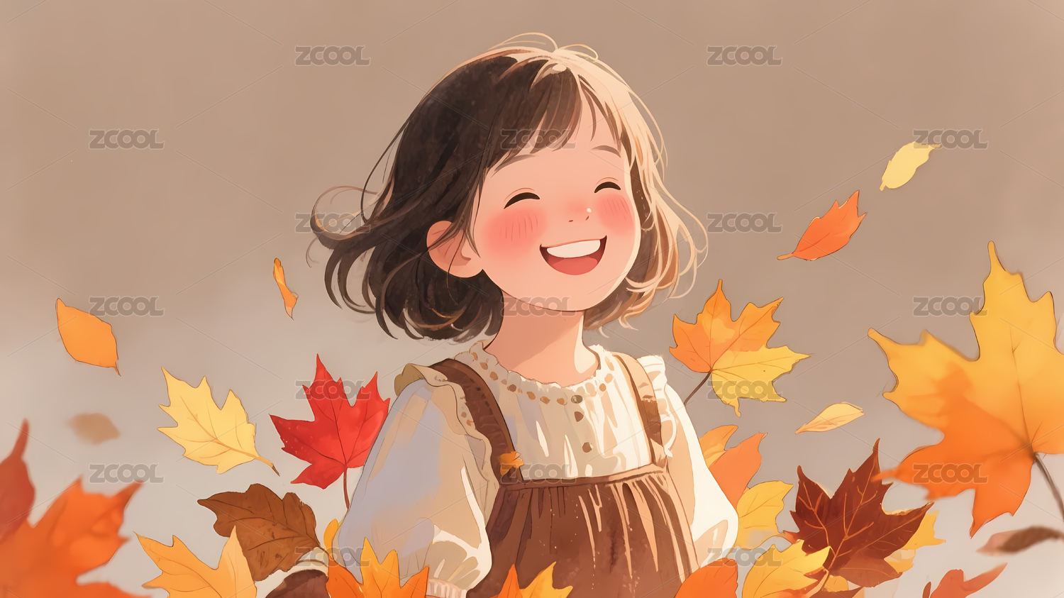 小女孩开心地在飘落的秋叶和雪花中玩耍
