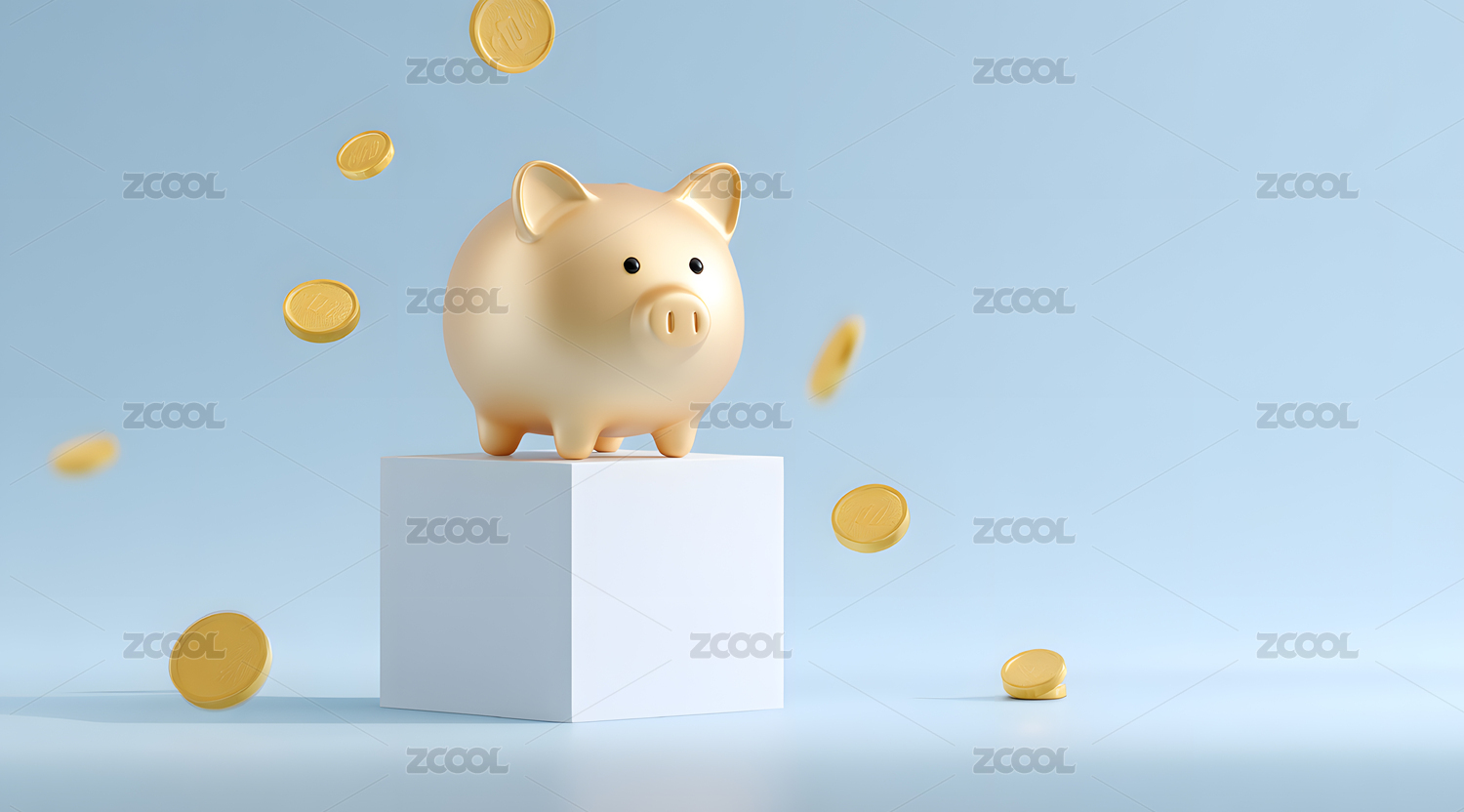 黄色背景上飘散的金币和粉色小猪存钱罐