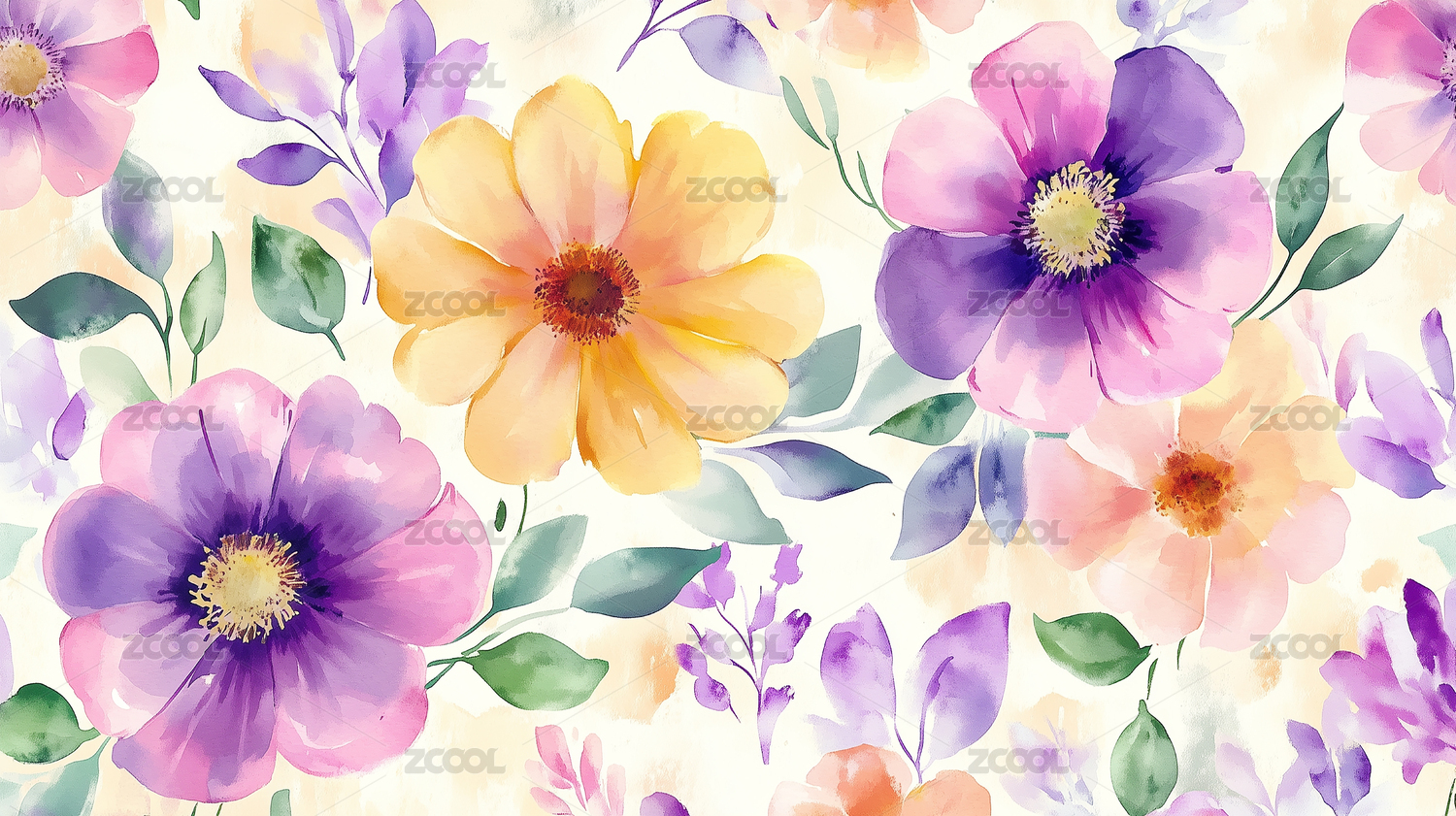 水彩,花卉,花朵,大花,碎花,紫色,粉色,绿色,叶子,印花