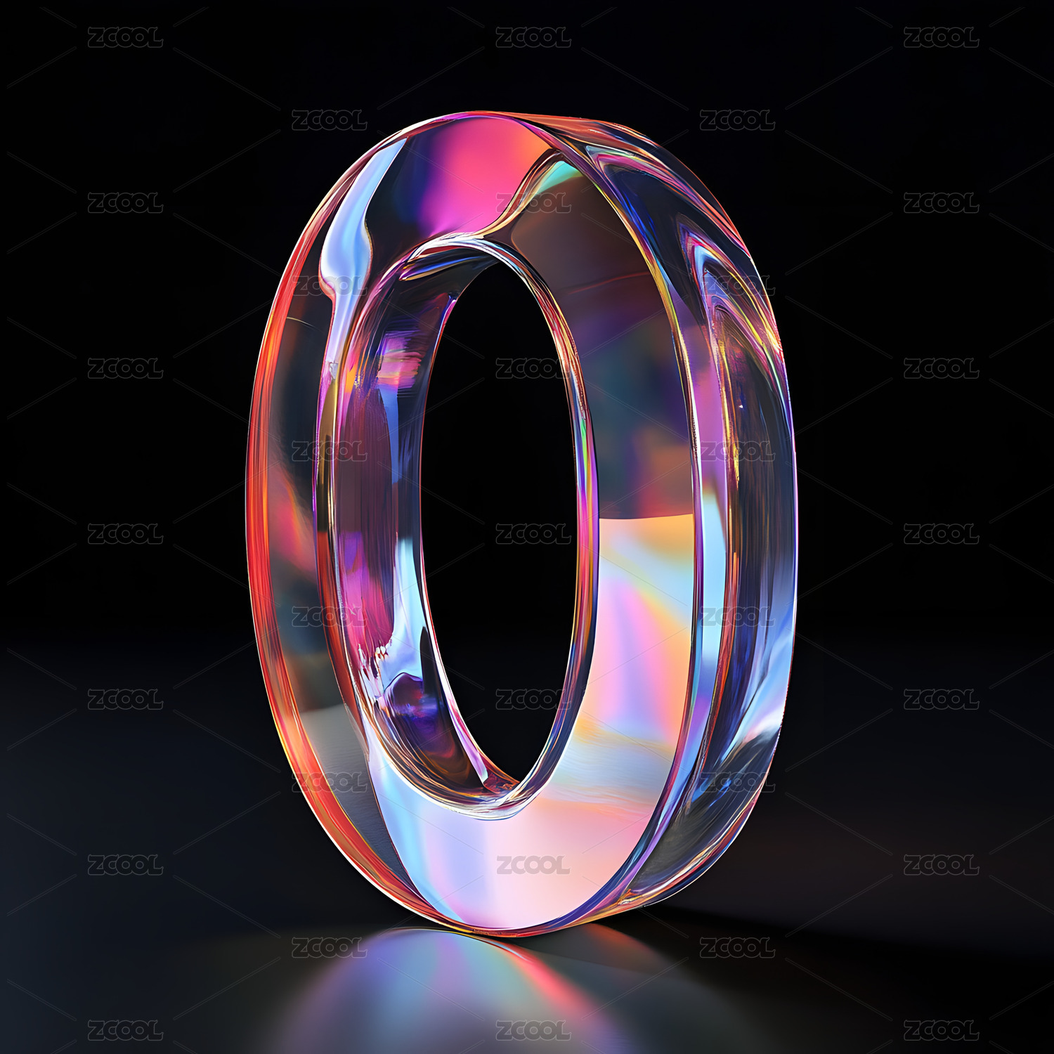 黑色背景上的水晶玻璃透明霓虹发光数字0