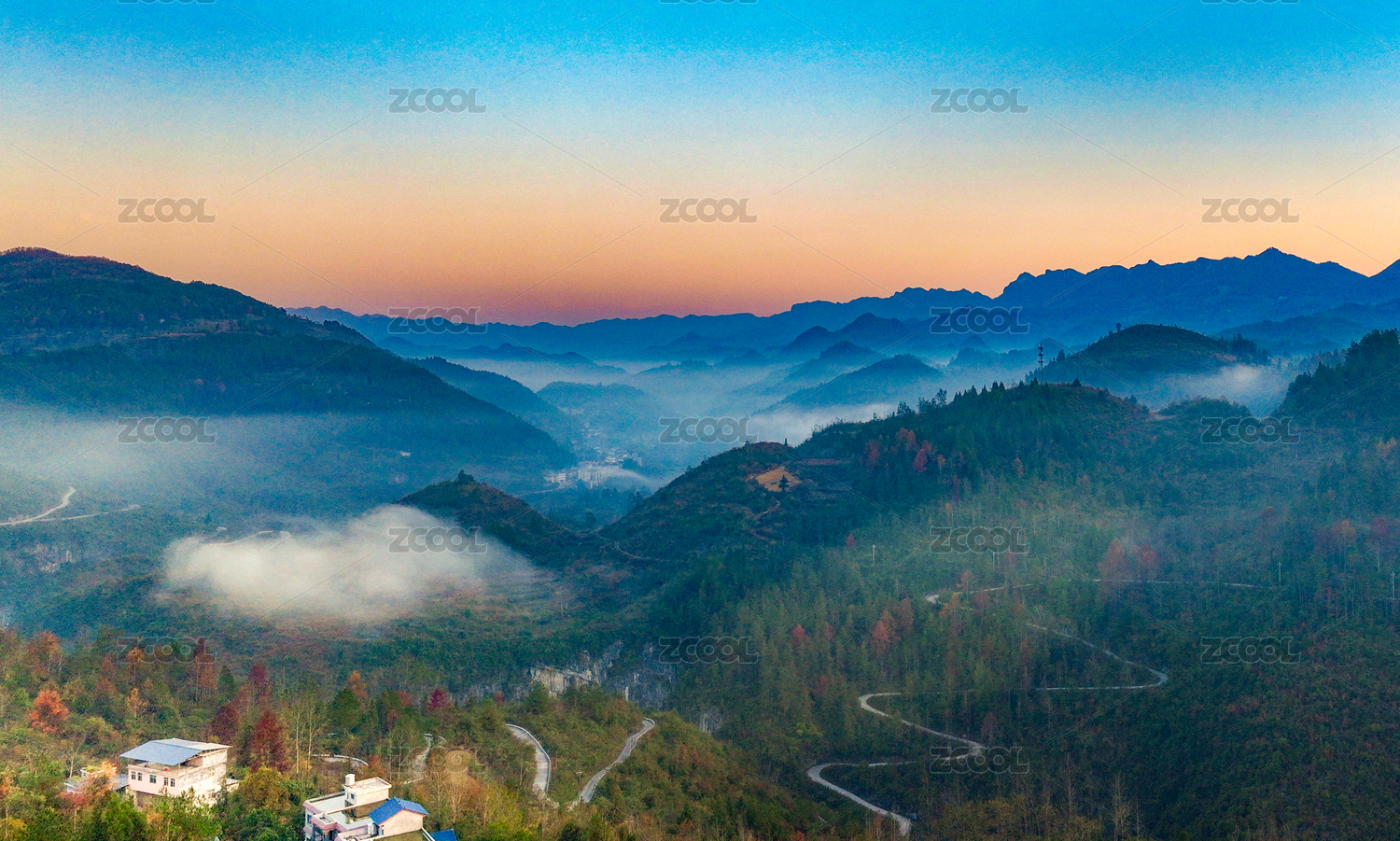 重庆酉阳路连山水、雾伴日升