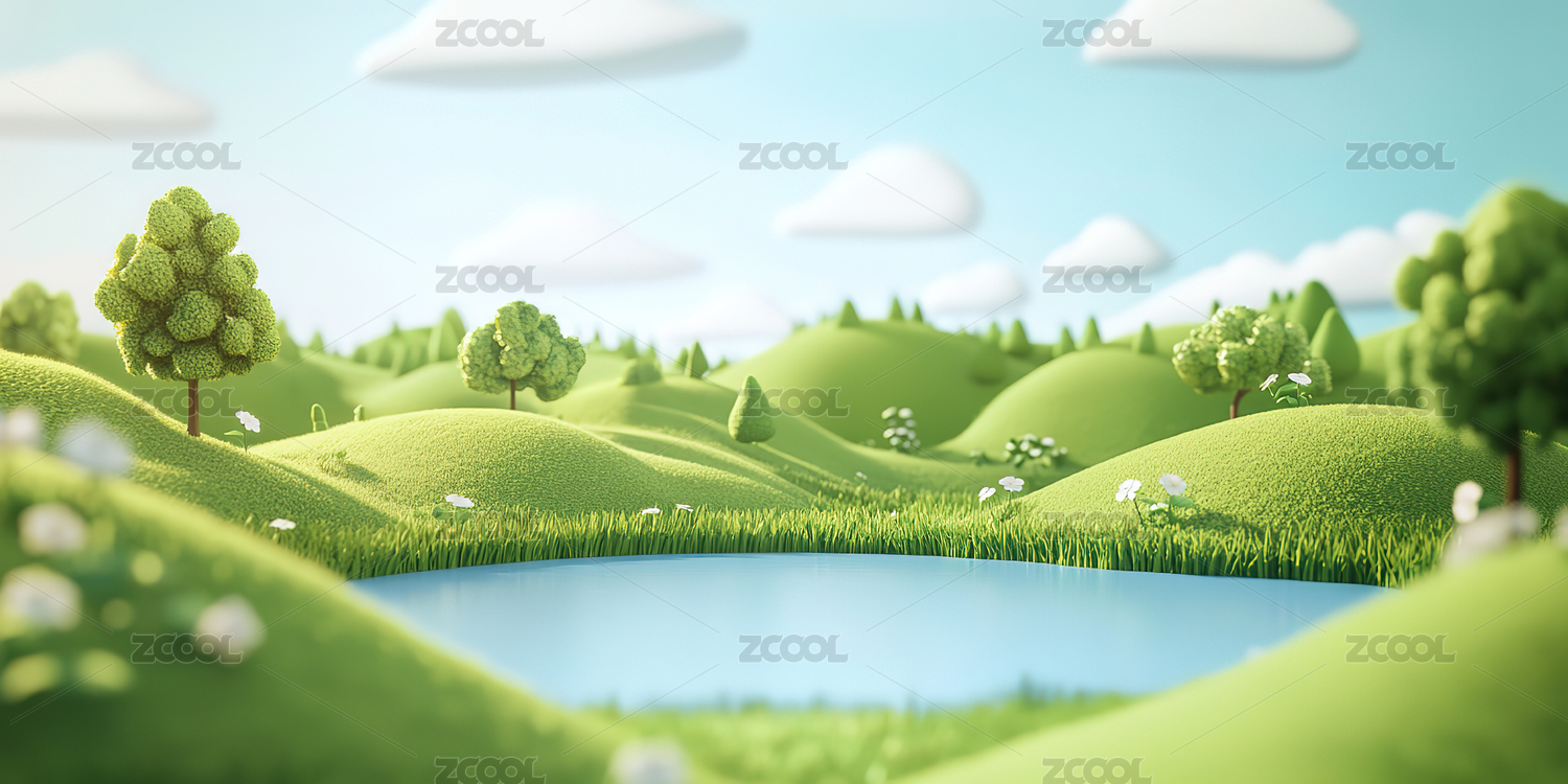 河流,树木,草地,荷叶,云朵,绿色,自然,卡通