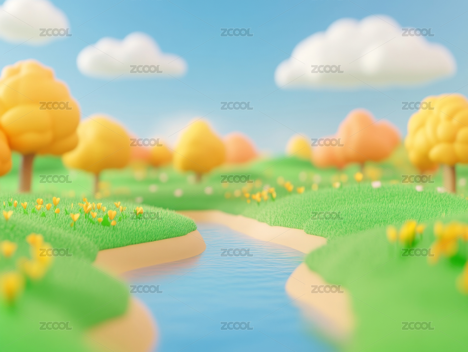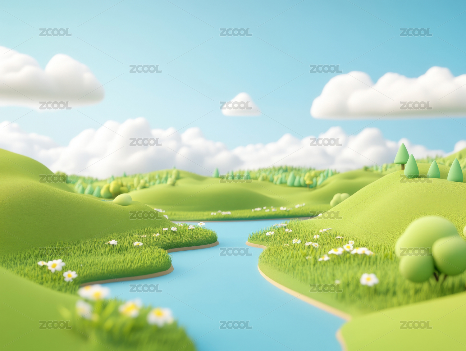 绿色的大堤中间蜿蜒的河流风景3D卡通插画