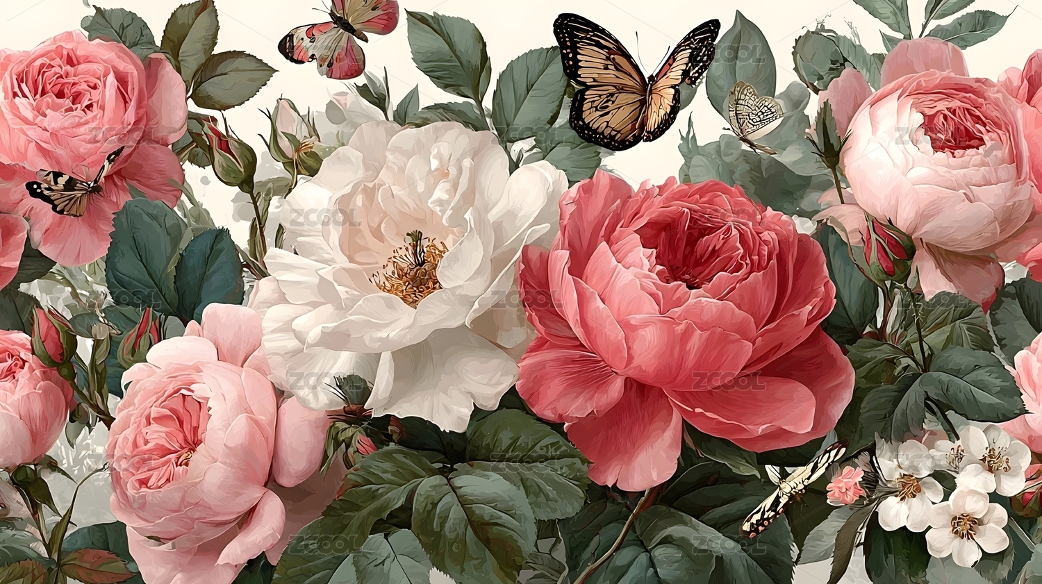 粉色玫瑰与蝴蝶的花卉图案