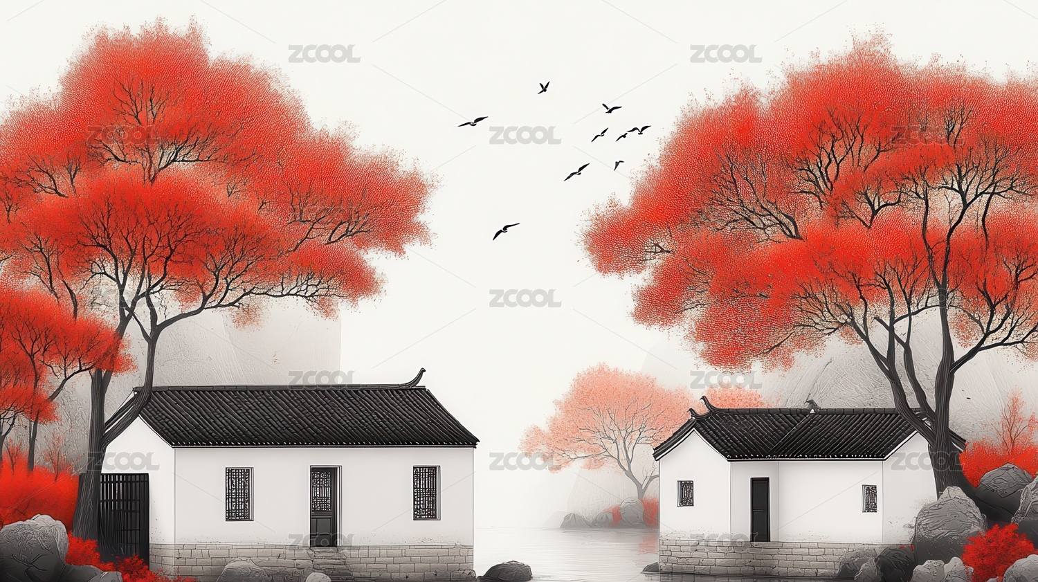 色调,草地,树木,山峦,云雾,乡村,房屋,屋顶,窗户,红叶
