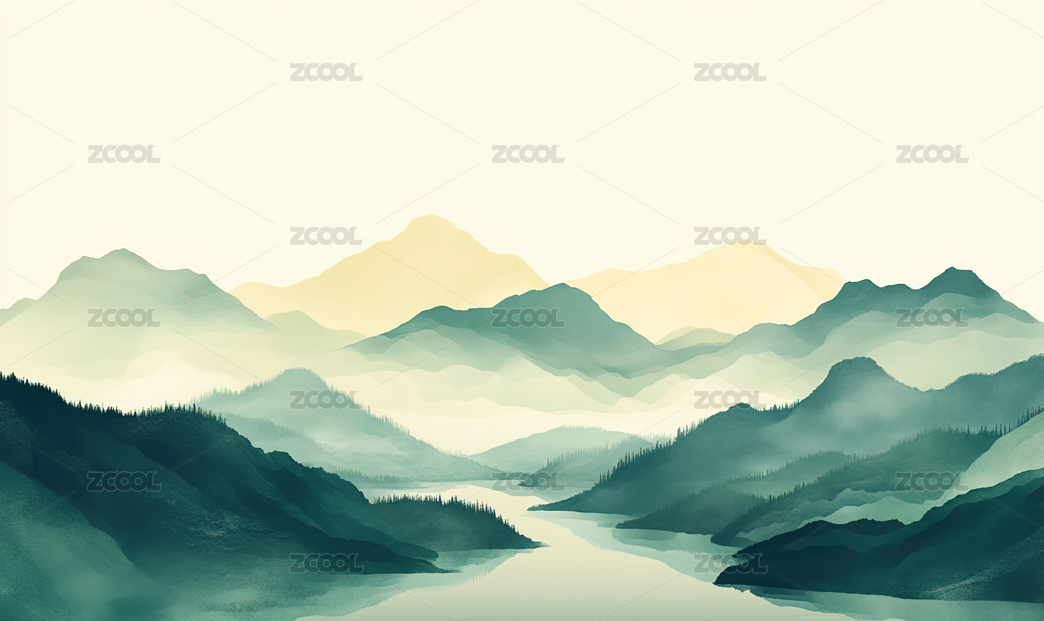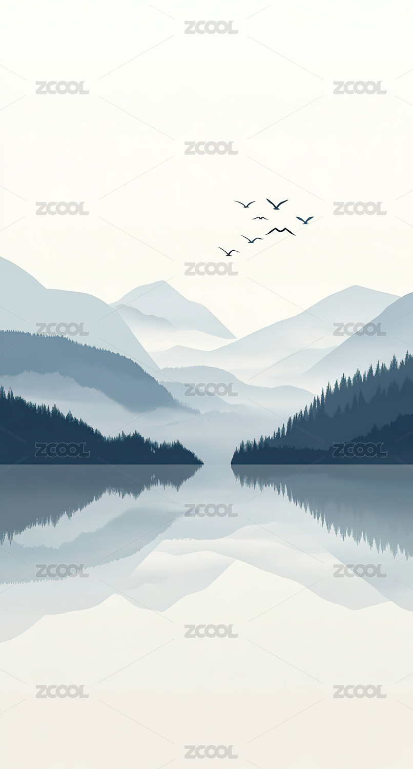 山峦倒影在湖面,水墨风格