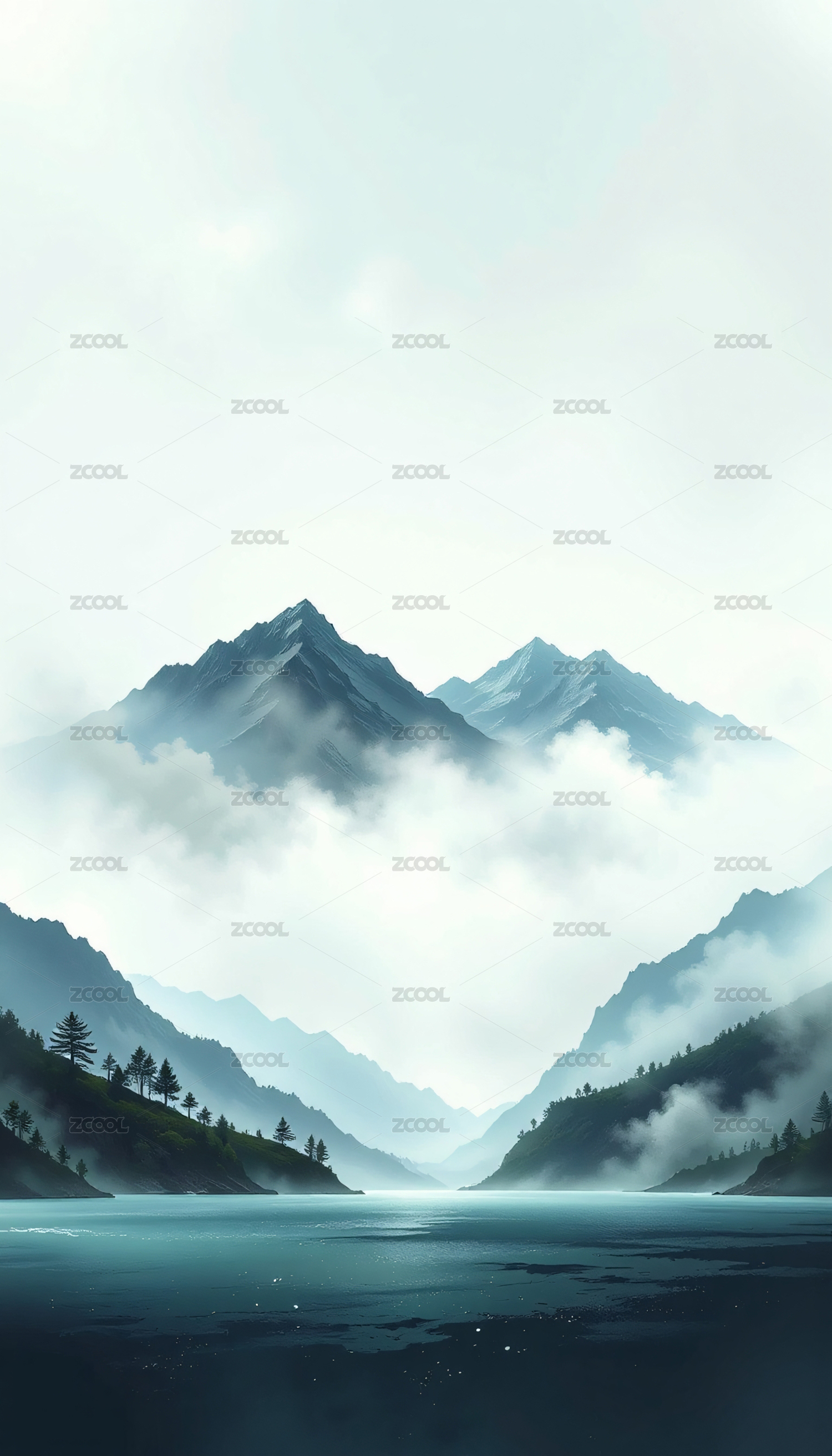 山水,云雾,湖泊,倒影,山峰,树木,自然,积雪,远景,宁静