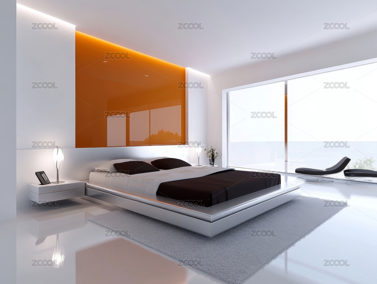 卧室,现代,简约,床,橙色墙,大窗户,自然光,白色,窗帘,木地板