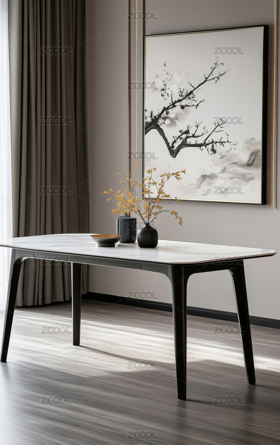 餐桌,椅子,吊灯,画作,窗帘,地板,室内,设计,简约,风格