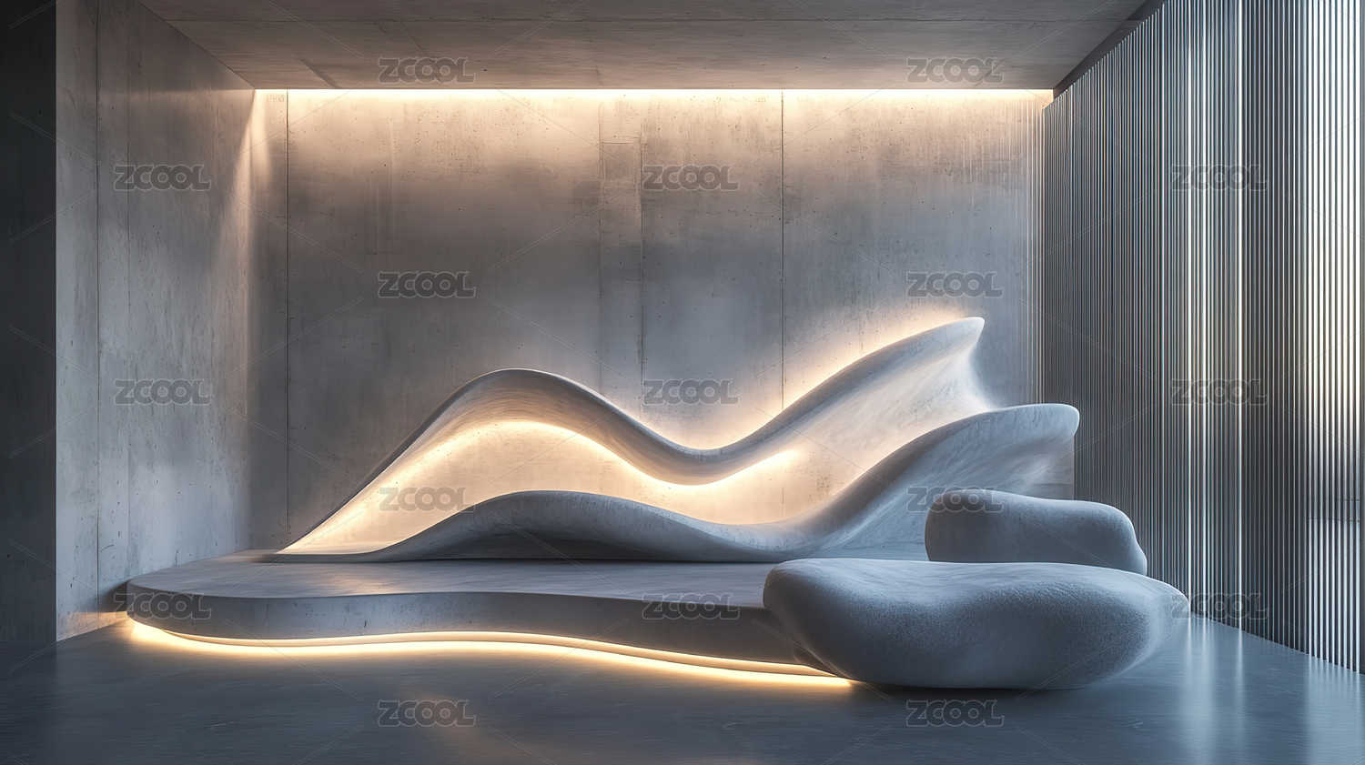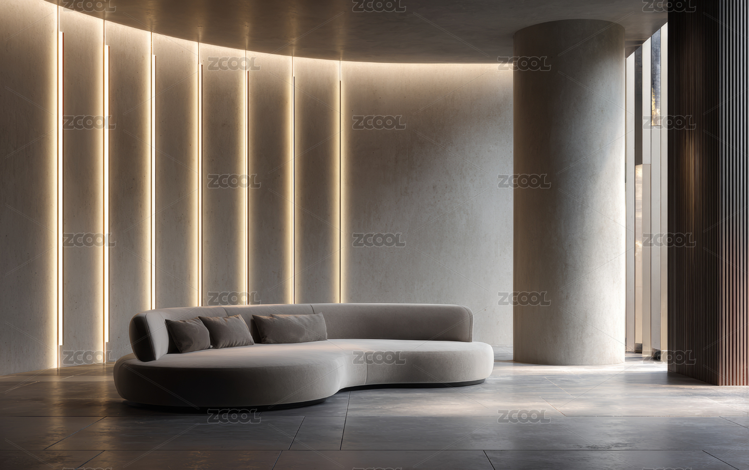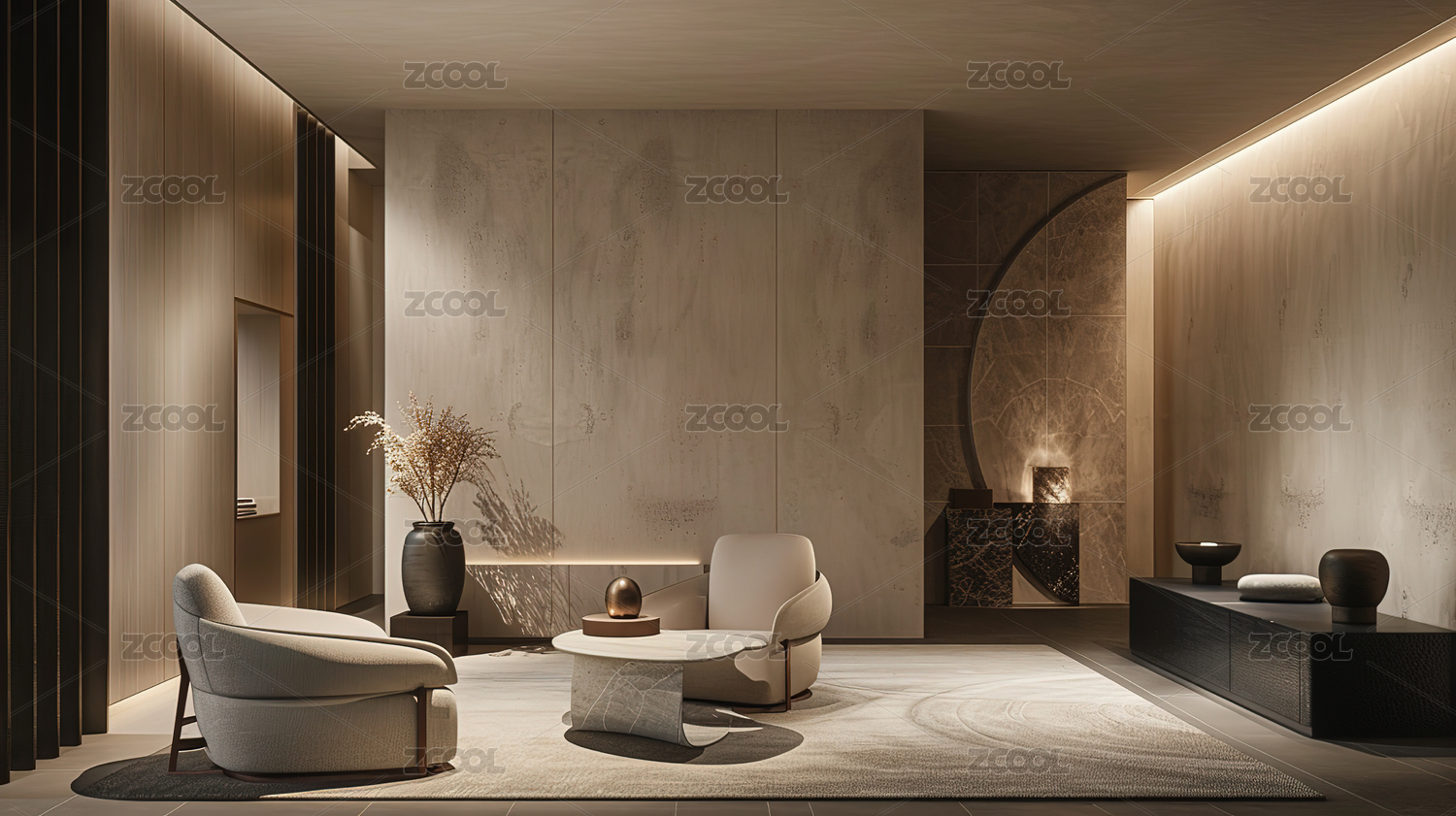温暖现代休闲空间:曲线木墙与舒适座椅