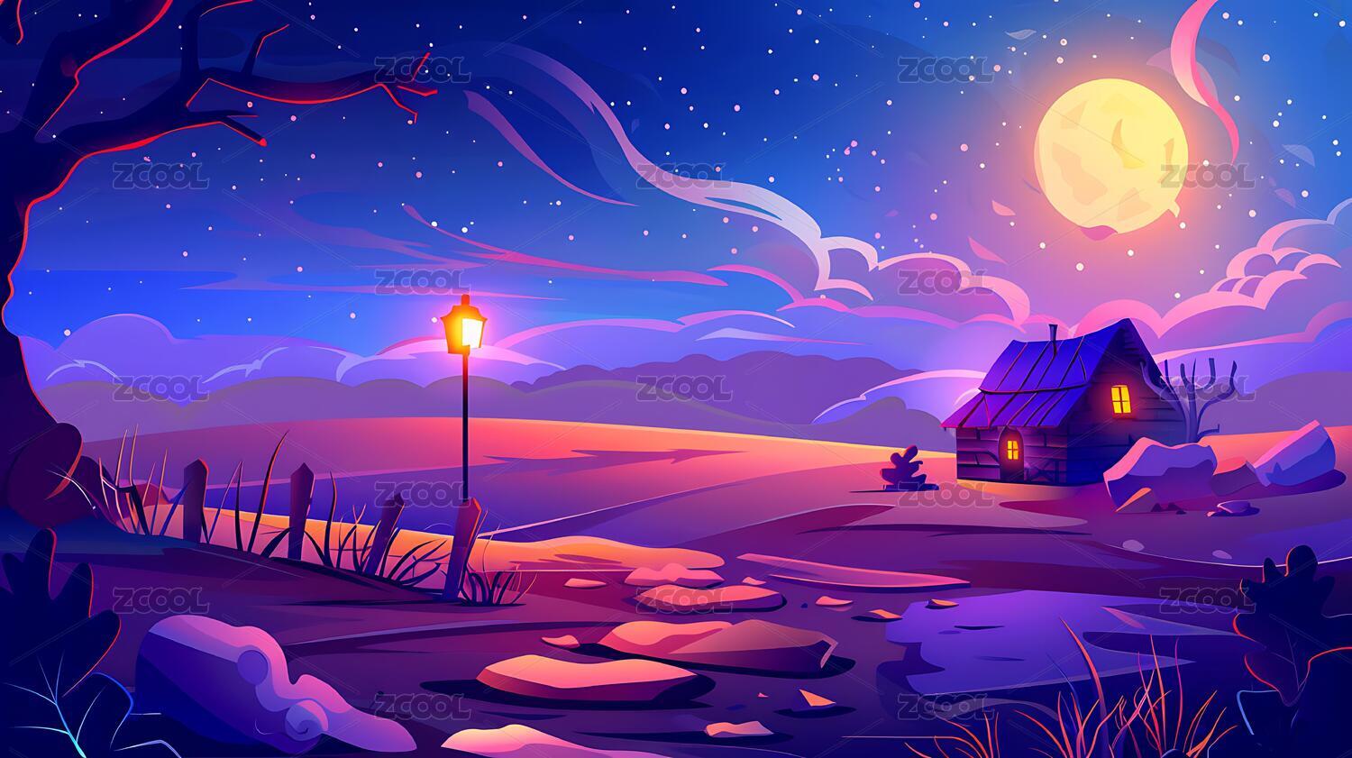 水彩, 蓝色, 橙色, 紫色, 梦幻, 树木, 灯光, 粉色, 森林, 星星