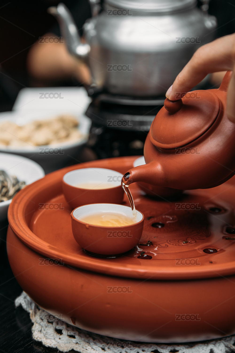 一只手用紫砂茶壶倒把刚泡好的潮州功夫茶倒入茶杯竖图