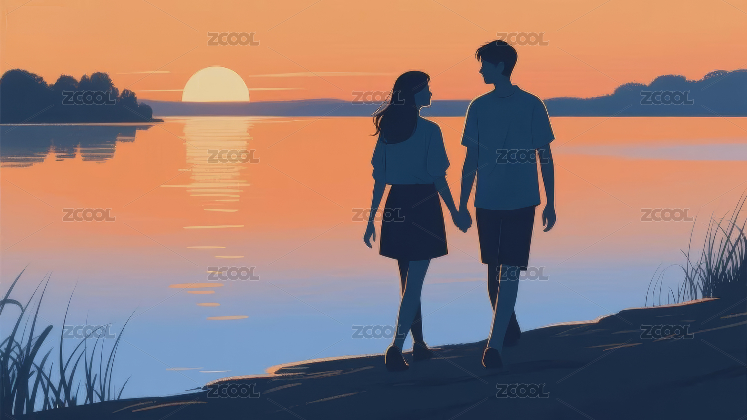 情人节七夕插画,一对情侣在夕阳下拥抱