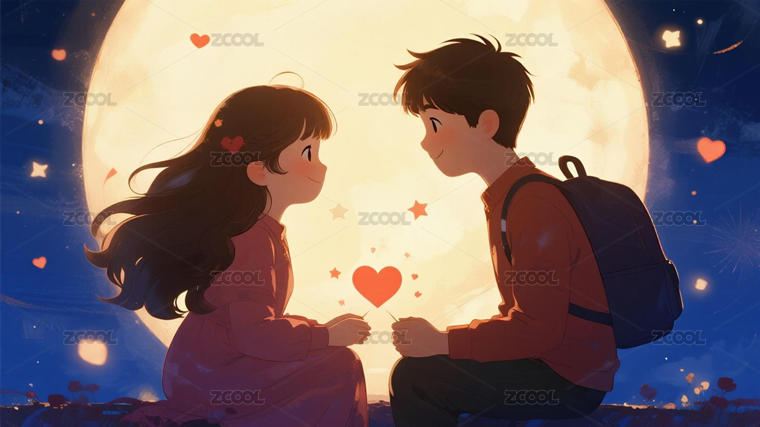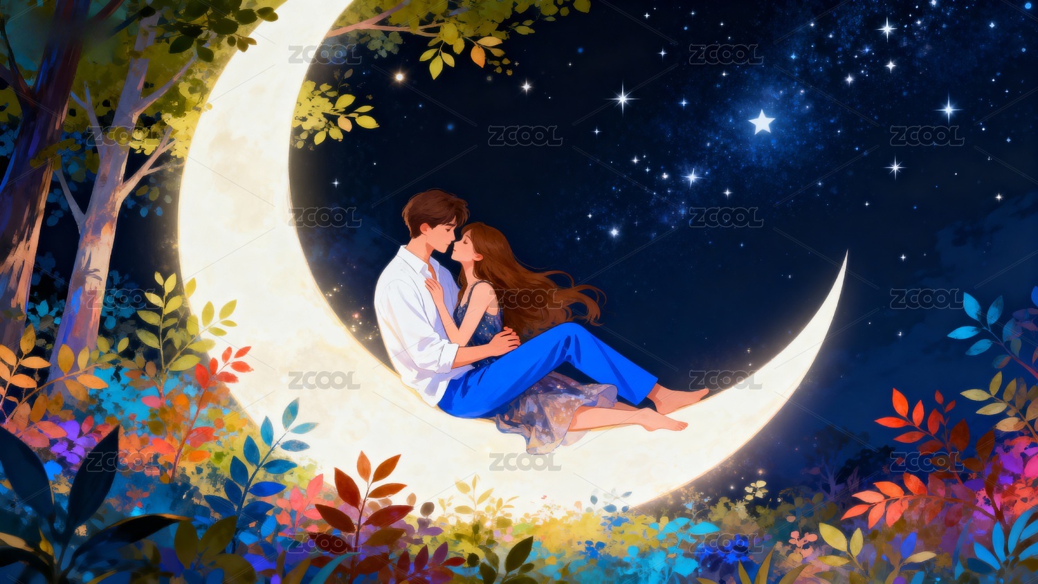 月亮星空下步行的青年情侣背影温馨梦幻手绘插画