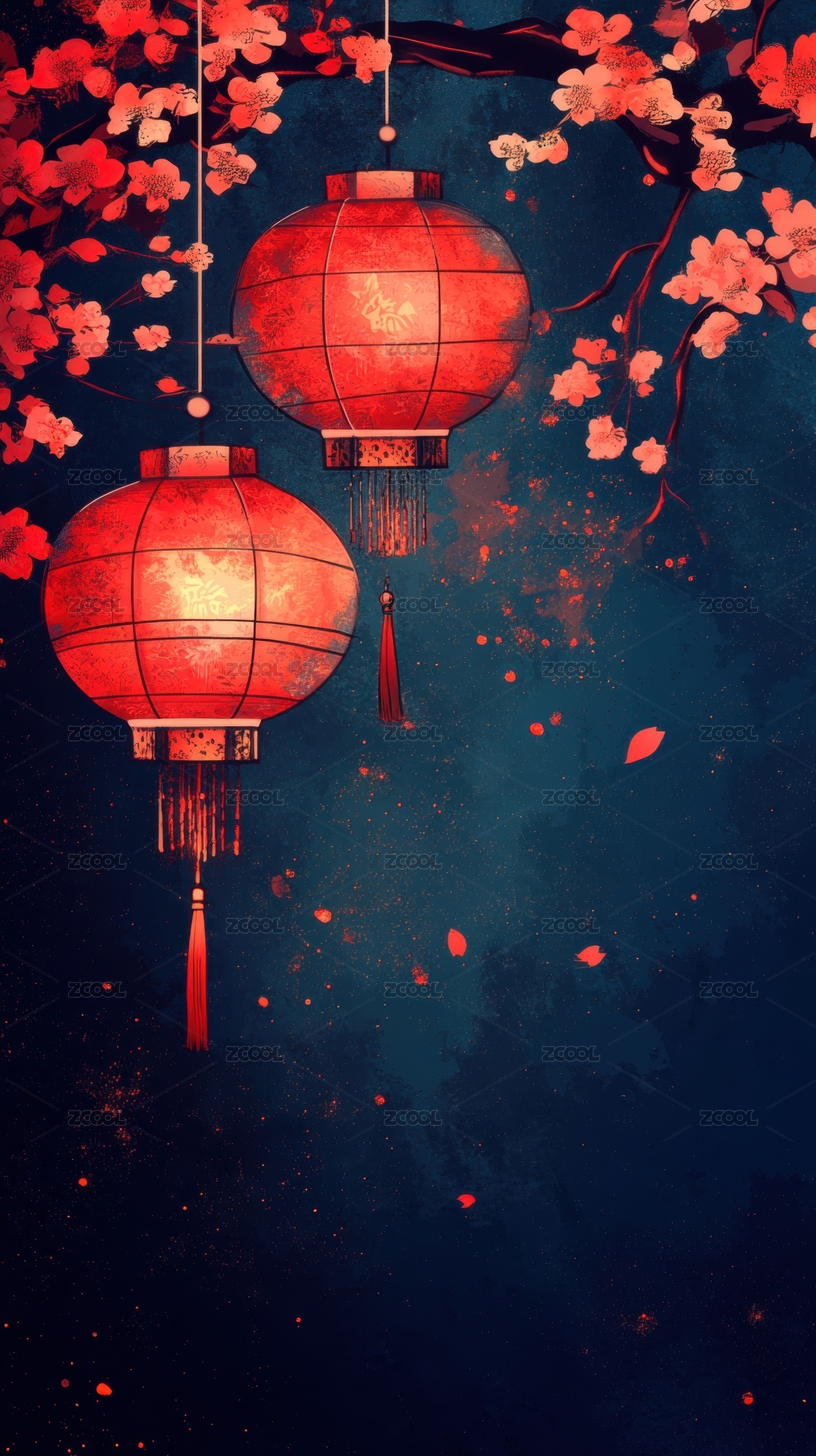 灯笼,烟花,夜空,星星,月亮,红色,喜庆,元宵节,插画,风格