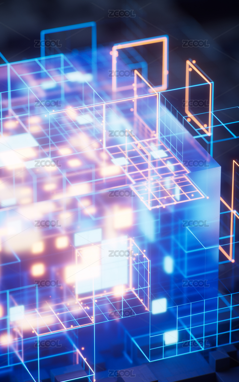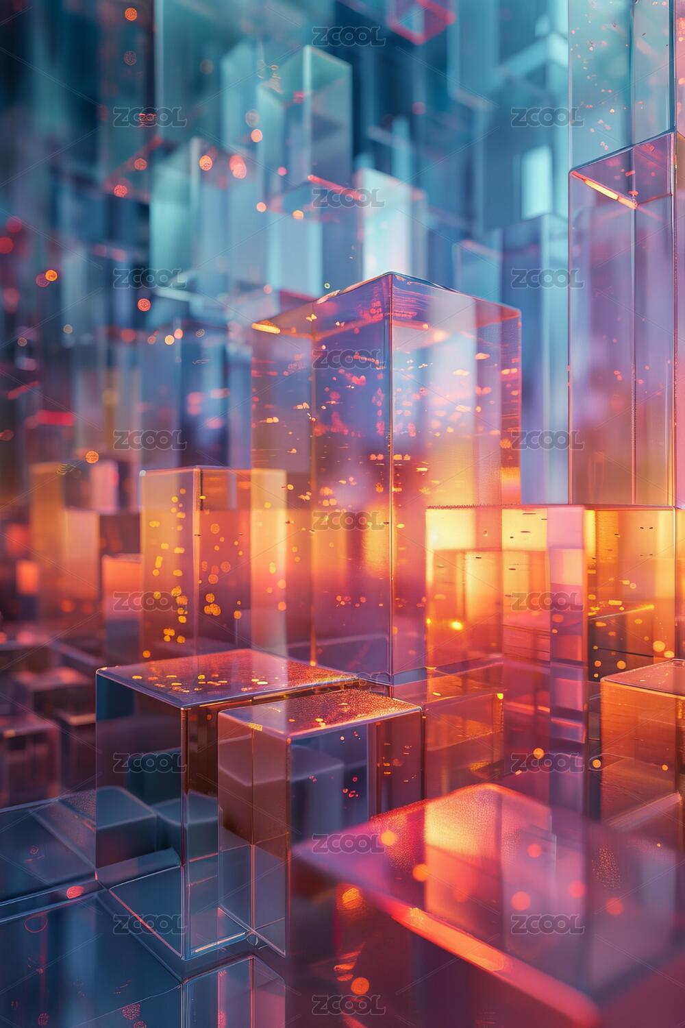 层叠排列荧光色立方体玻璃晶体3D立体插画