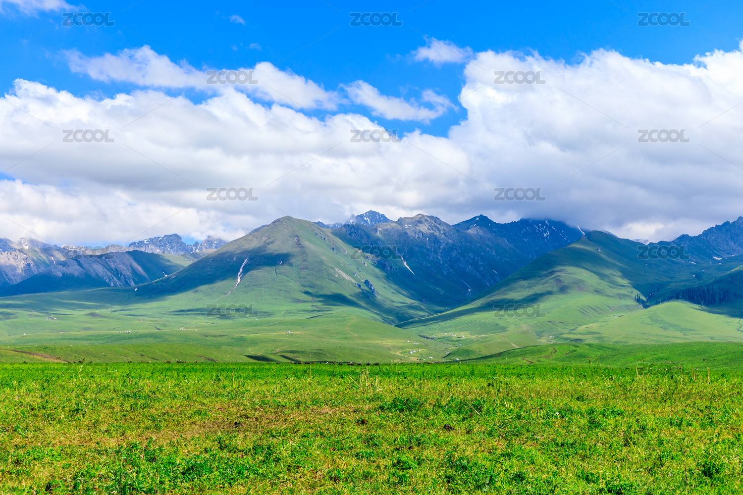中国新疆夏季蓝天白云下G217独库公路沿途高山草原