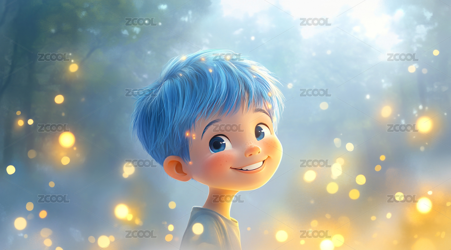 蓝发男孩在光斑森林中微笑