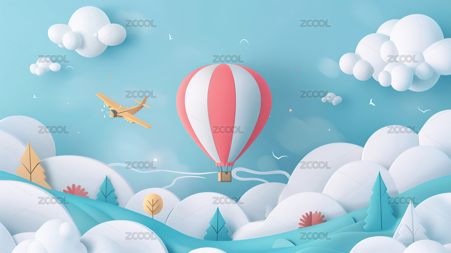 剪纸风格的热气球飞在空中