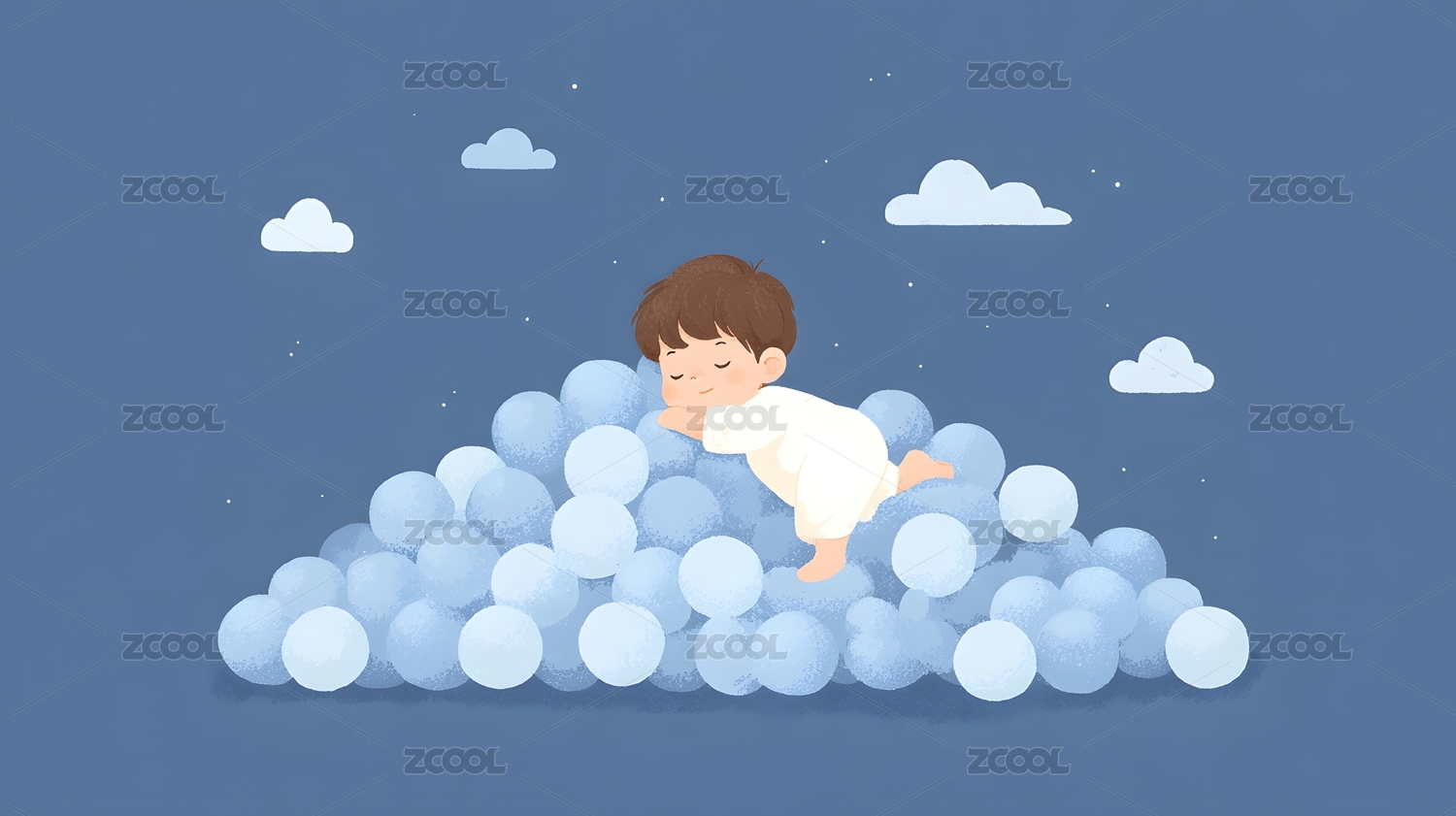 儿童节插画,空中踏着云朵的小女孩和泰迪熊