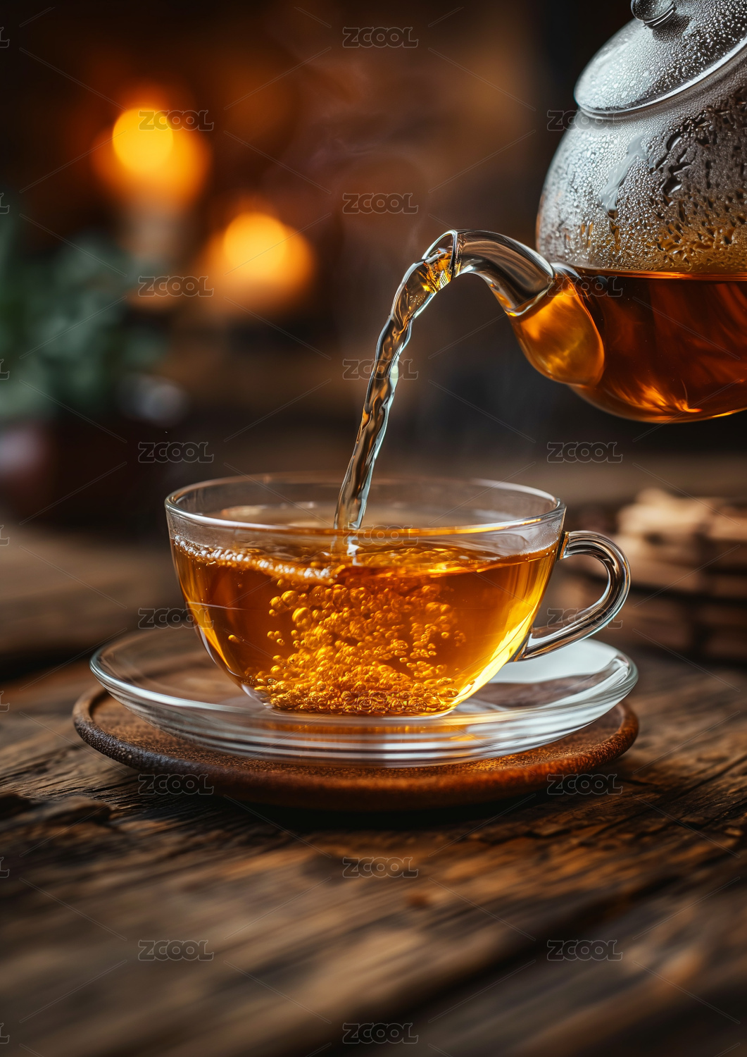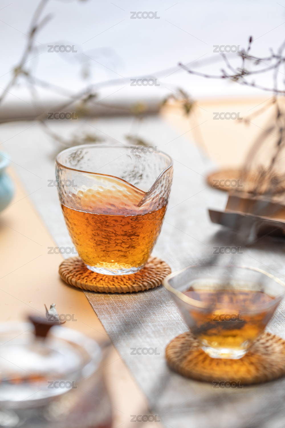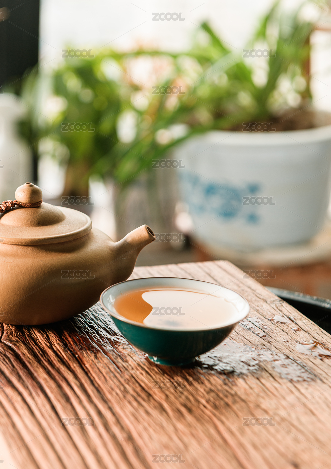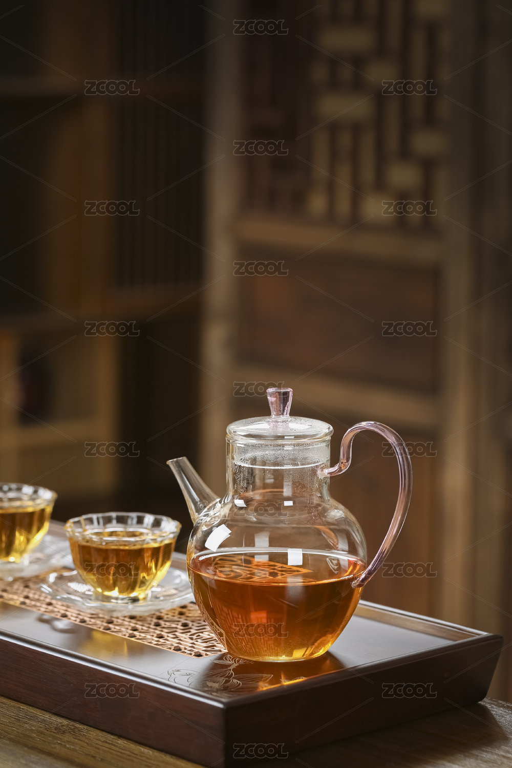 仿古玻璃茶壶冲泡的茶水摆放在窗棂影木桌面