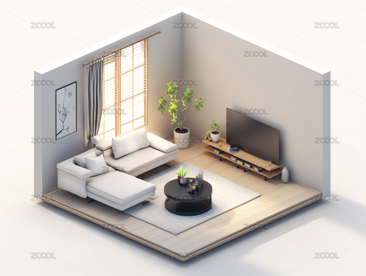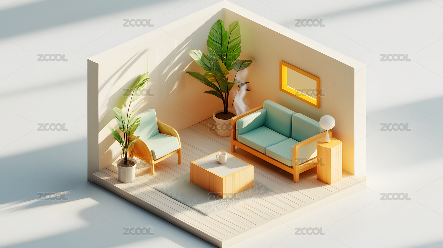 冷色客厅装修俯视立体轴测图3D卡通插画