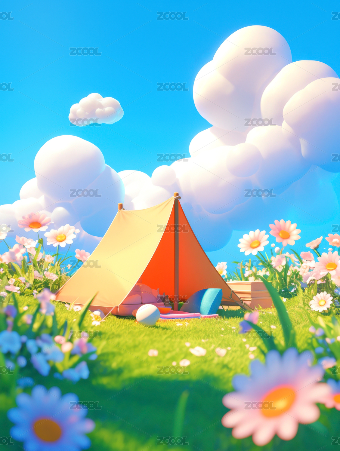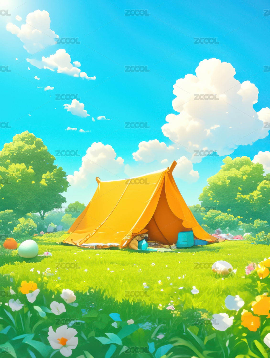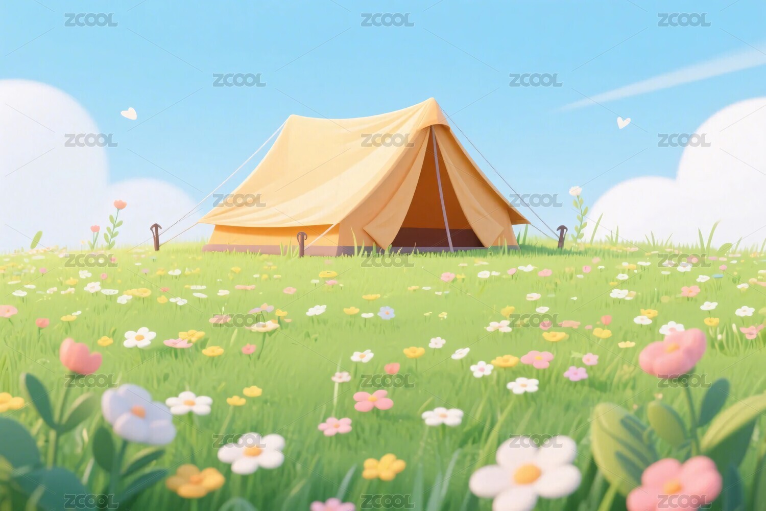 春天,帐篷,露营,旅行,田园,卡通,插画,背景,草地,花朵