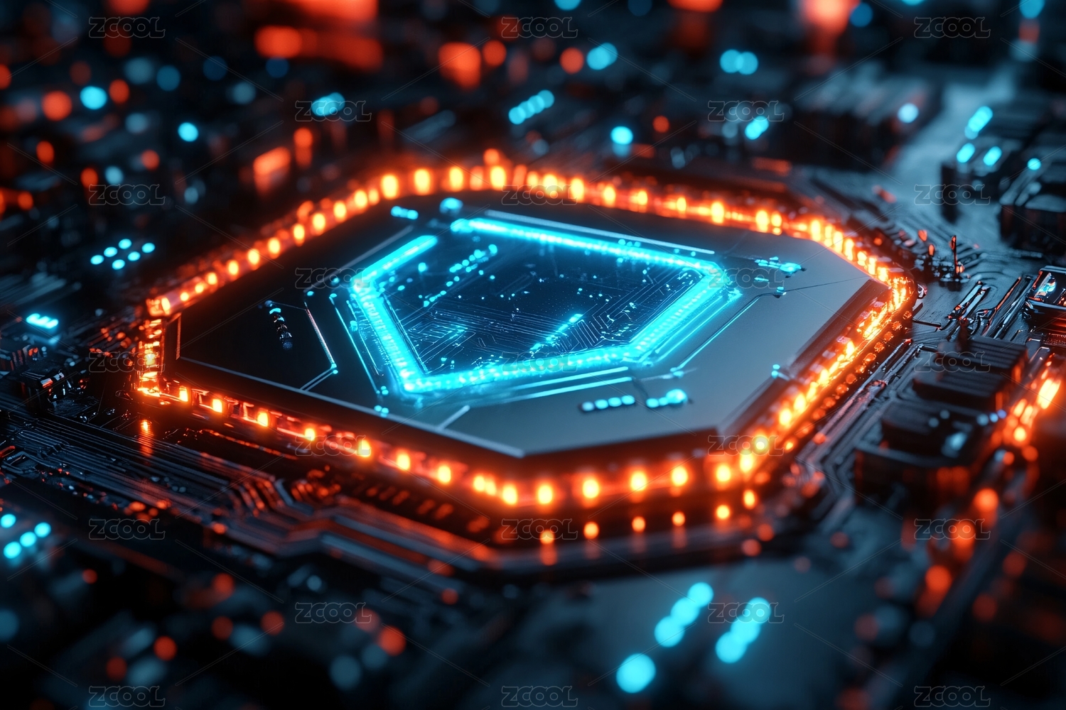 抽象的高科技背景,科技感电路与芯片3D渲
