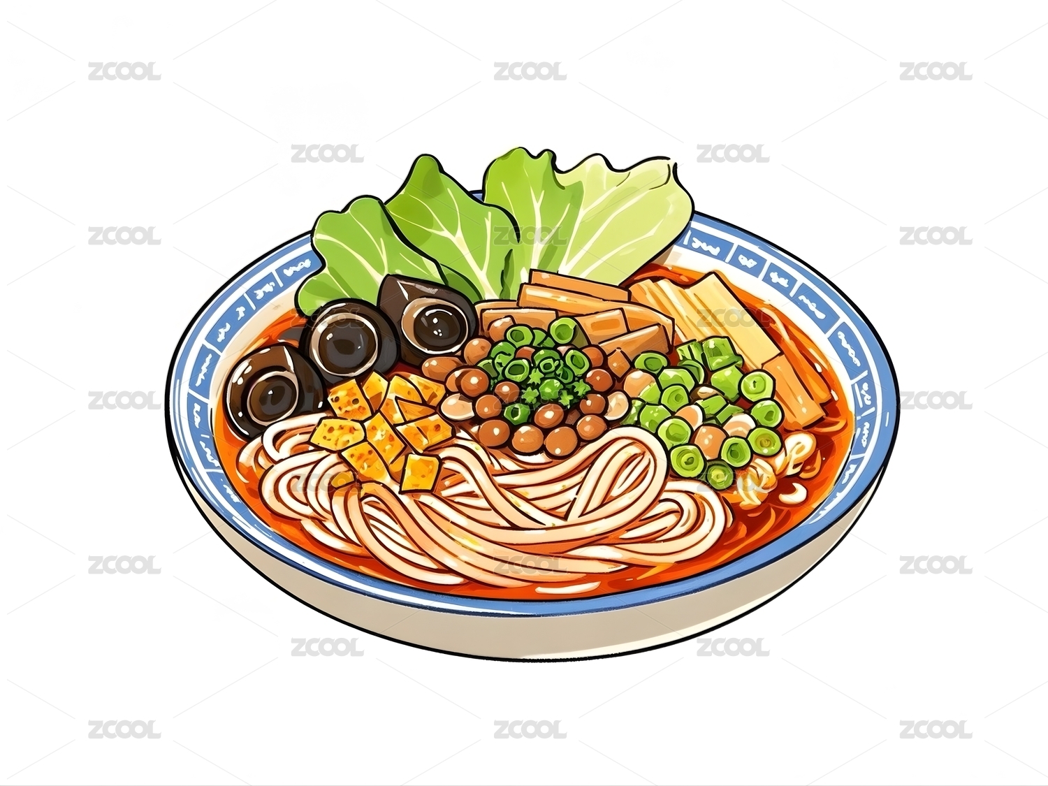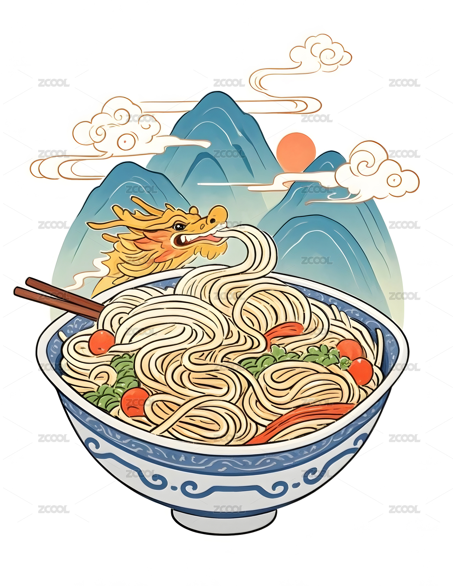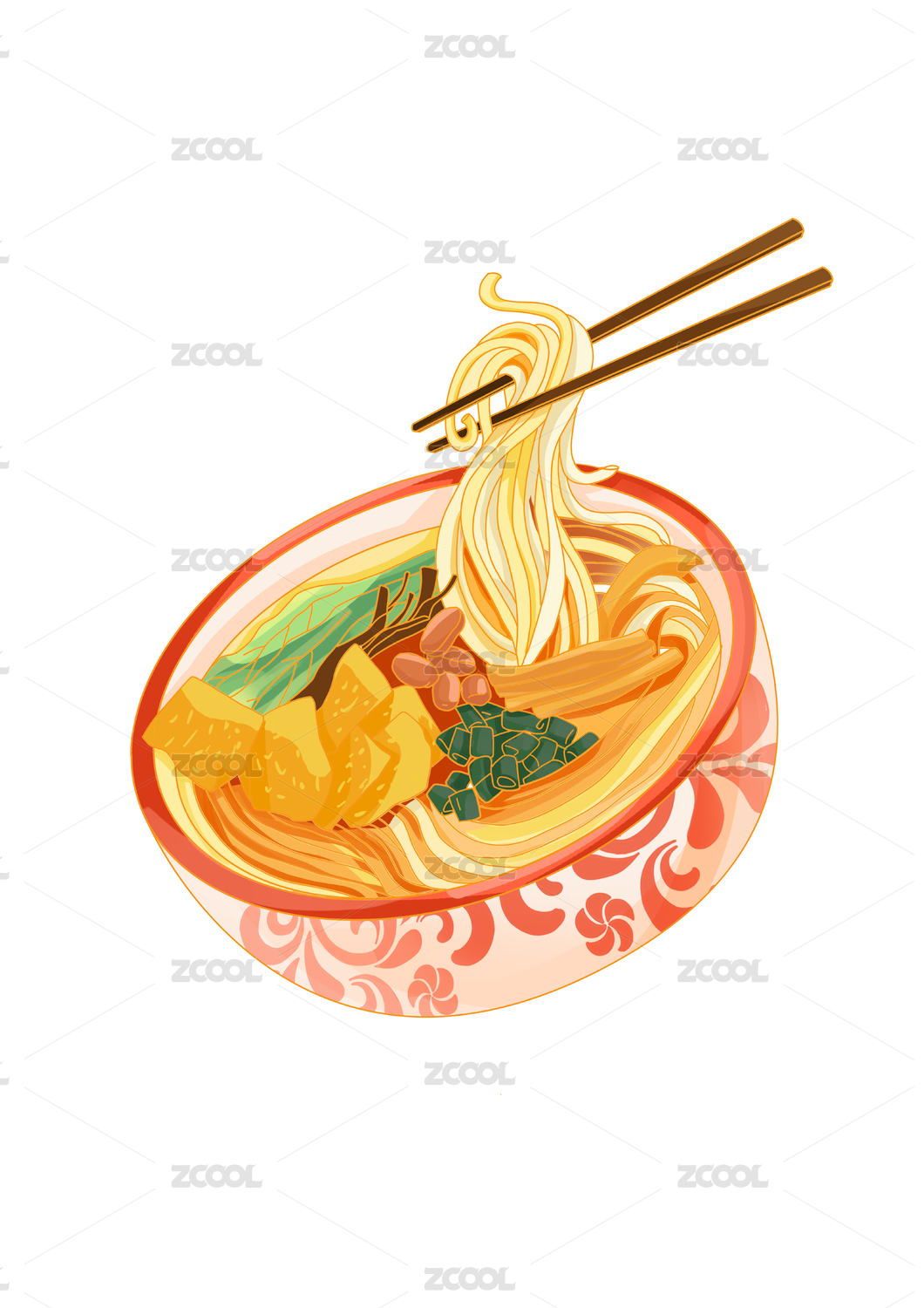 筷子挑起一碗诱人的米粉面条干拌面小吃手绘