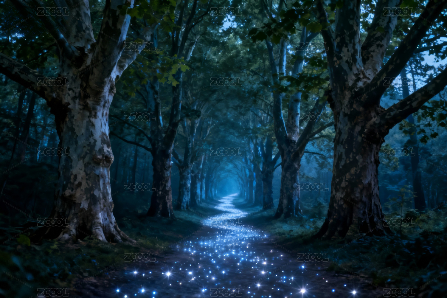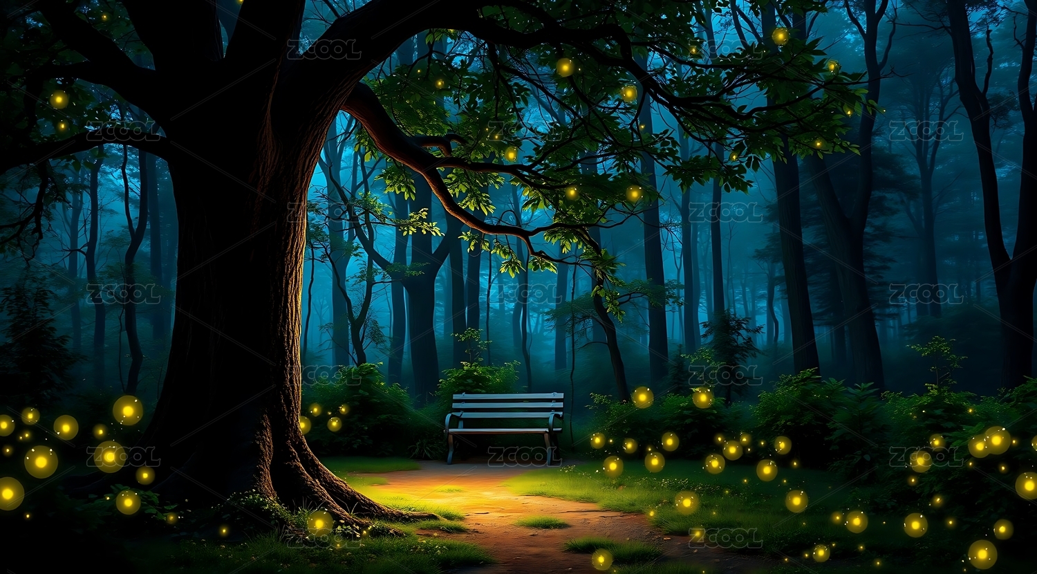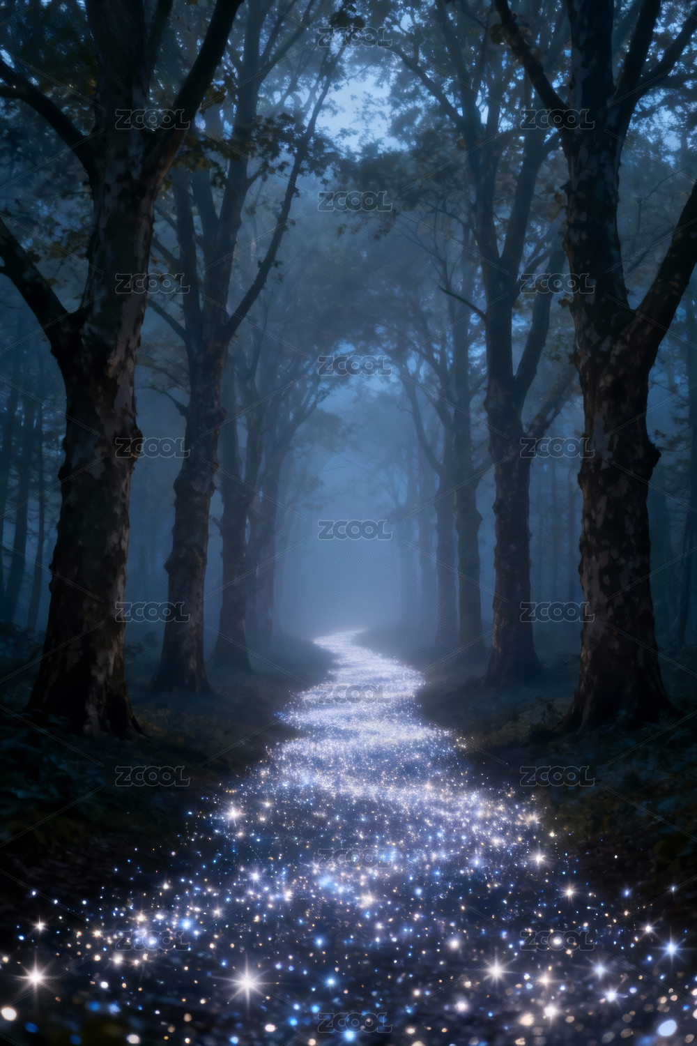 森林夜晚星空河流萤火虫神秘宁静唯美插画