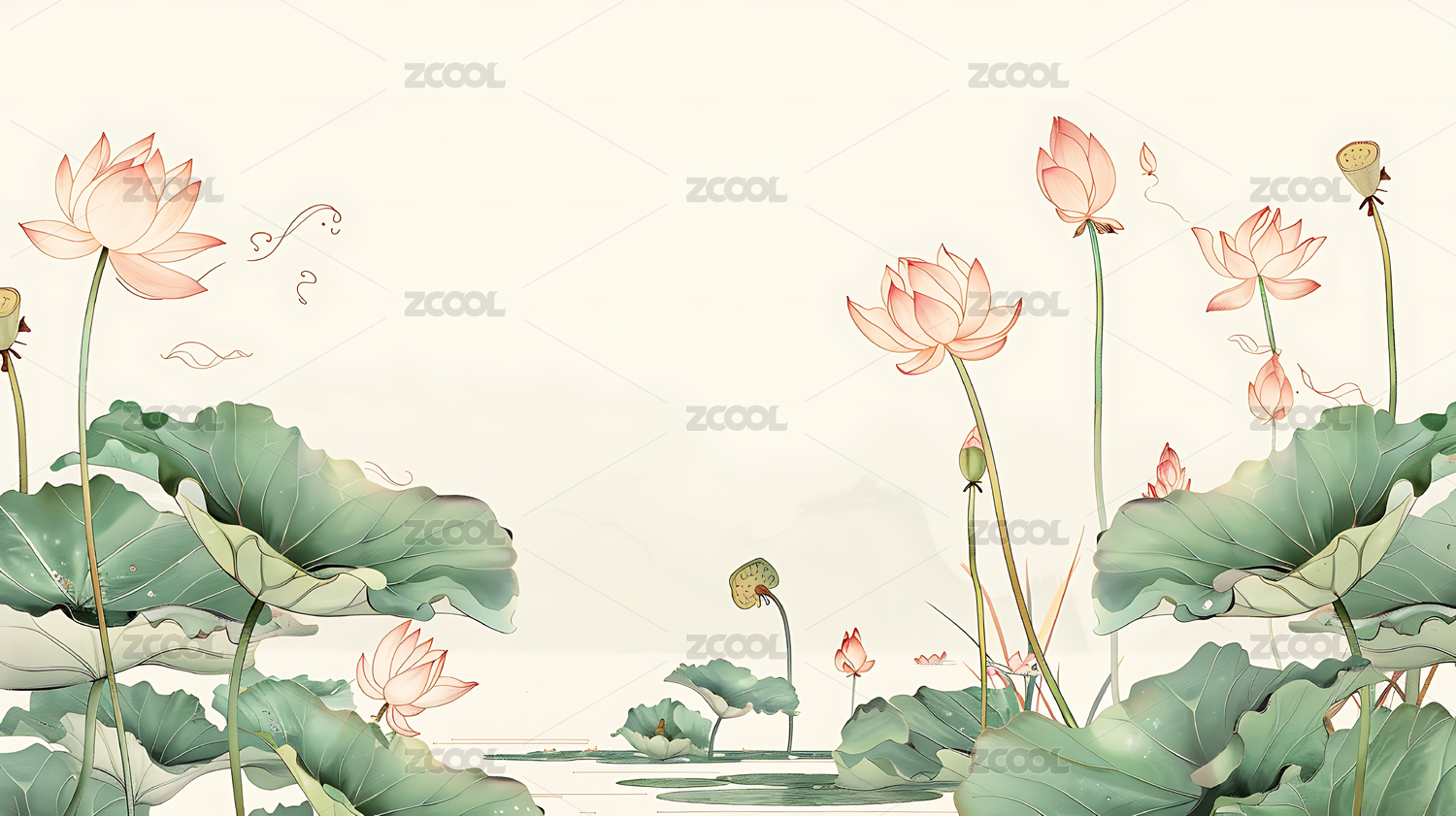 中国风荷花荷叶淡彩水墨插画壁纸背景