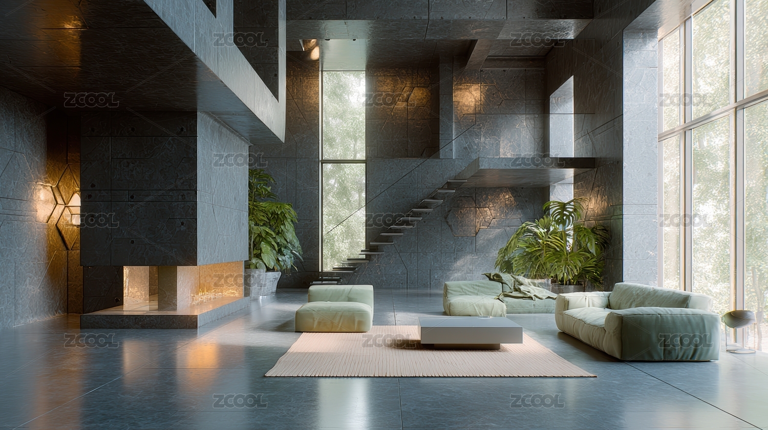 混凝墙模块沙发玻璃几