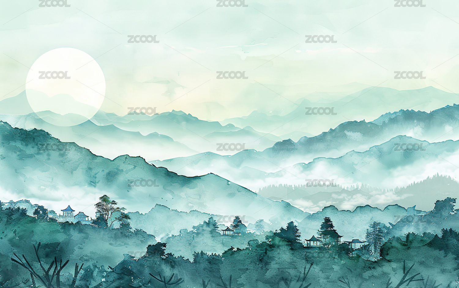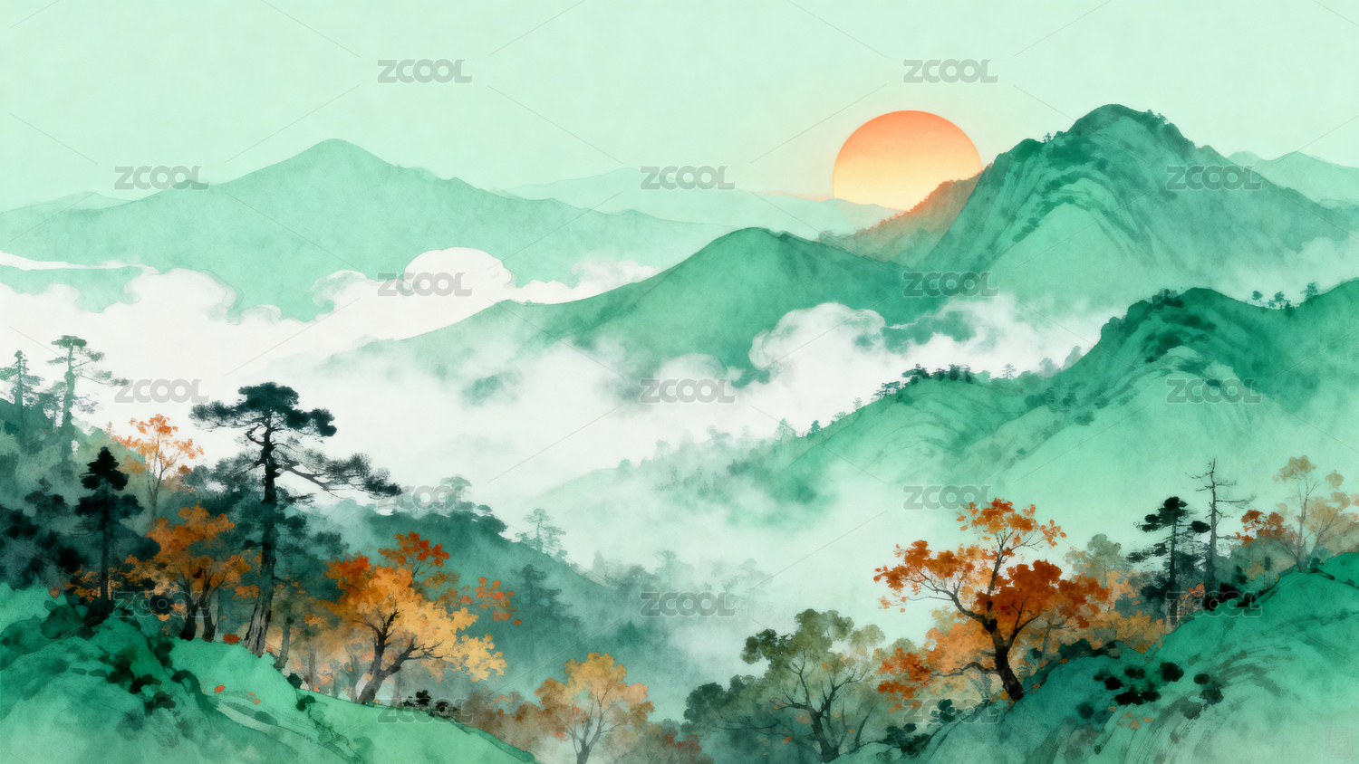 意境,宁静,和谐,祥和,山峰,村落,房屋,树木,云雾,日落