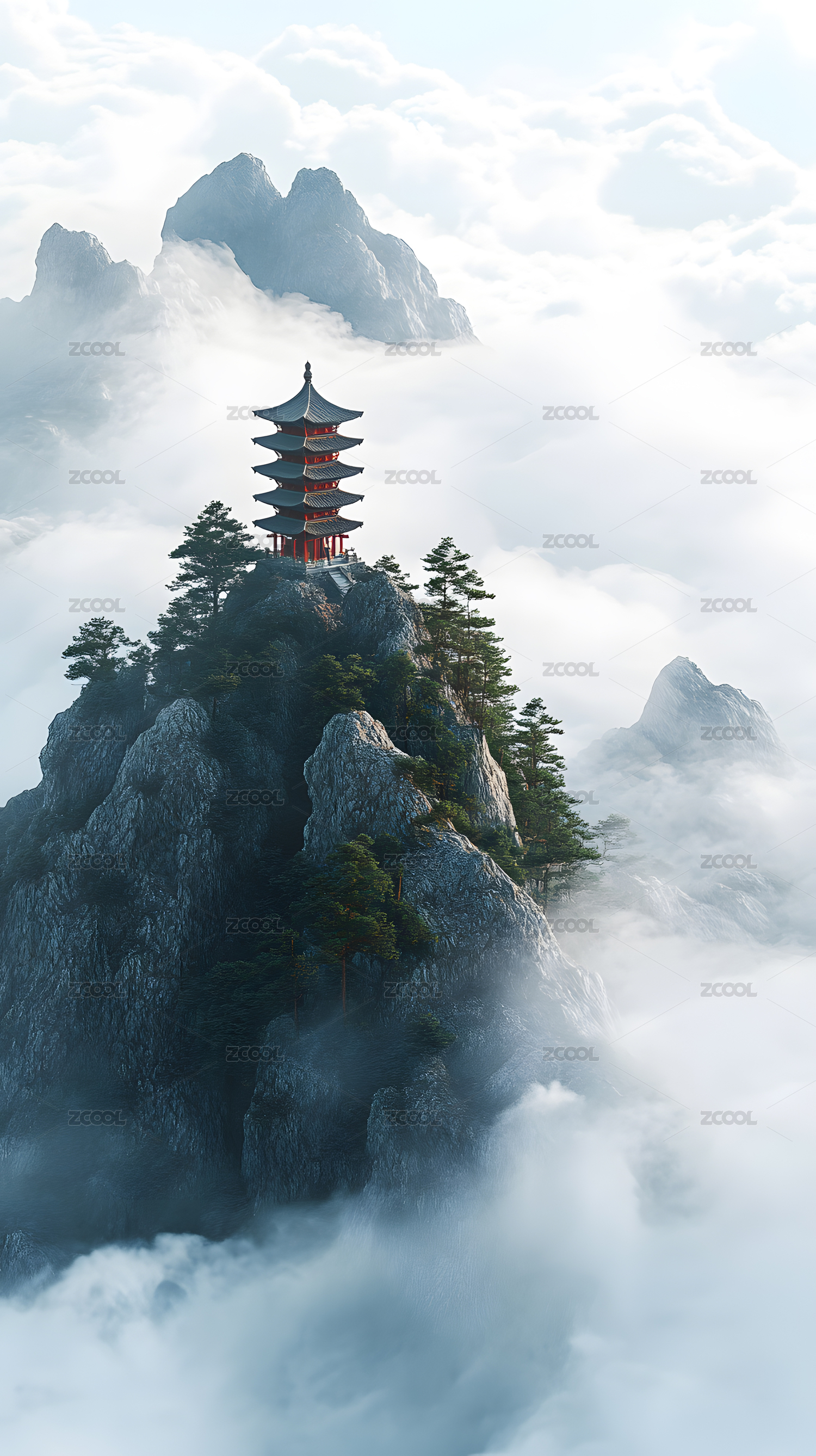山顶云海中的红色宝塔