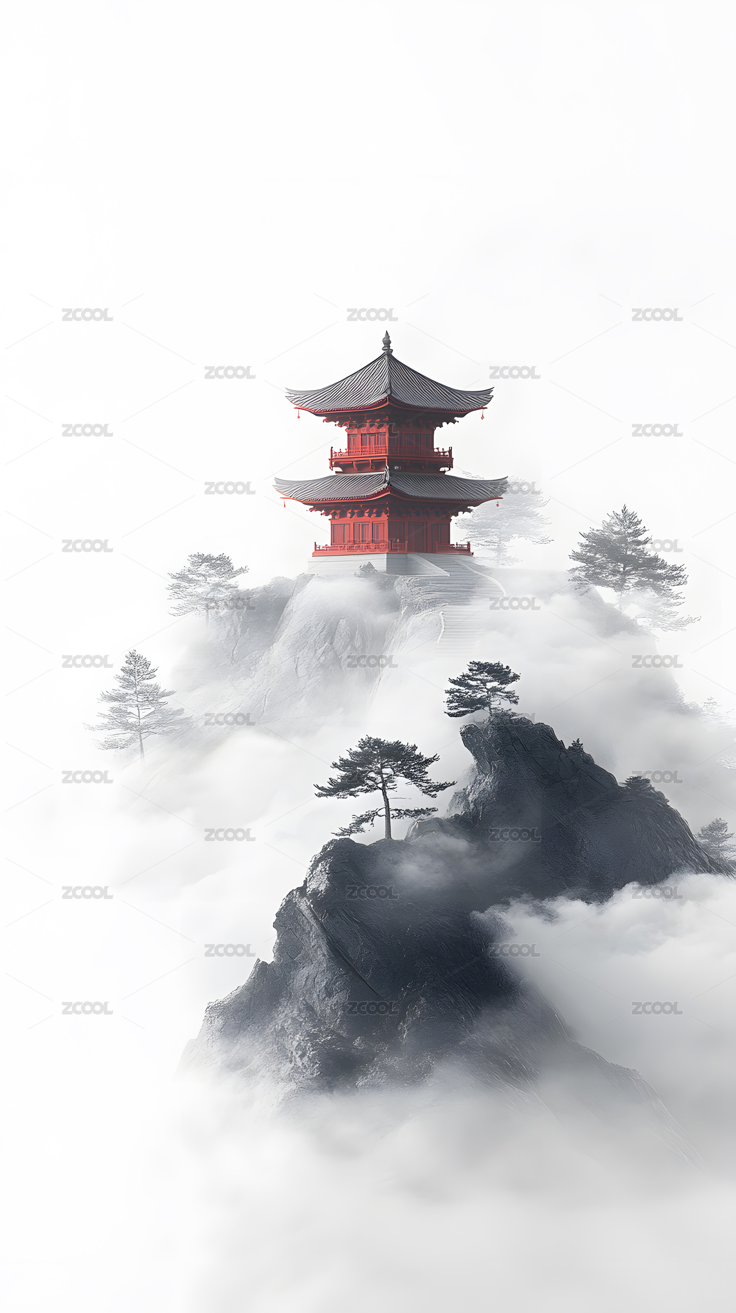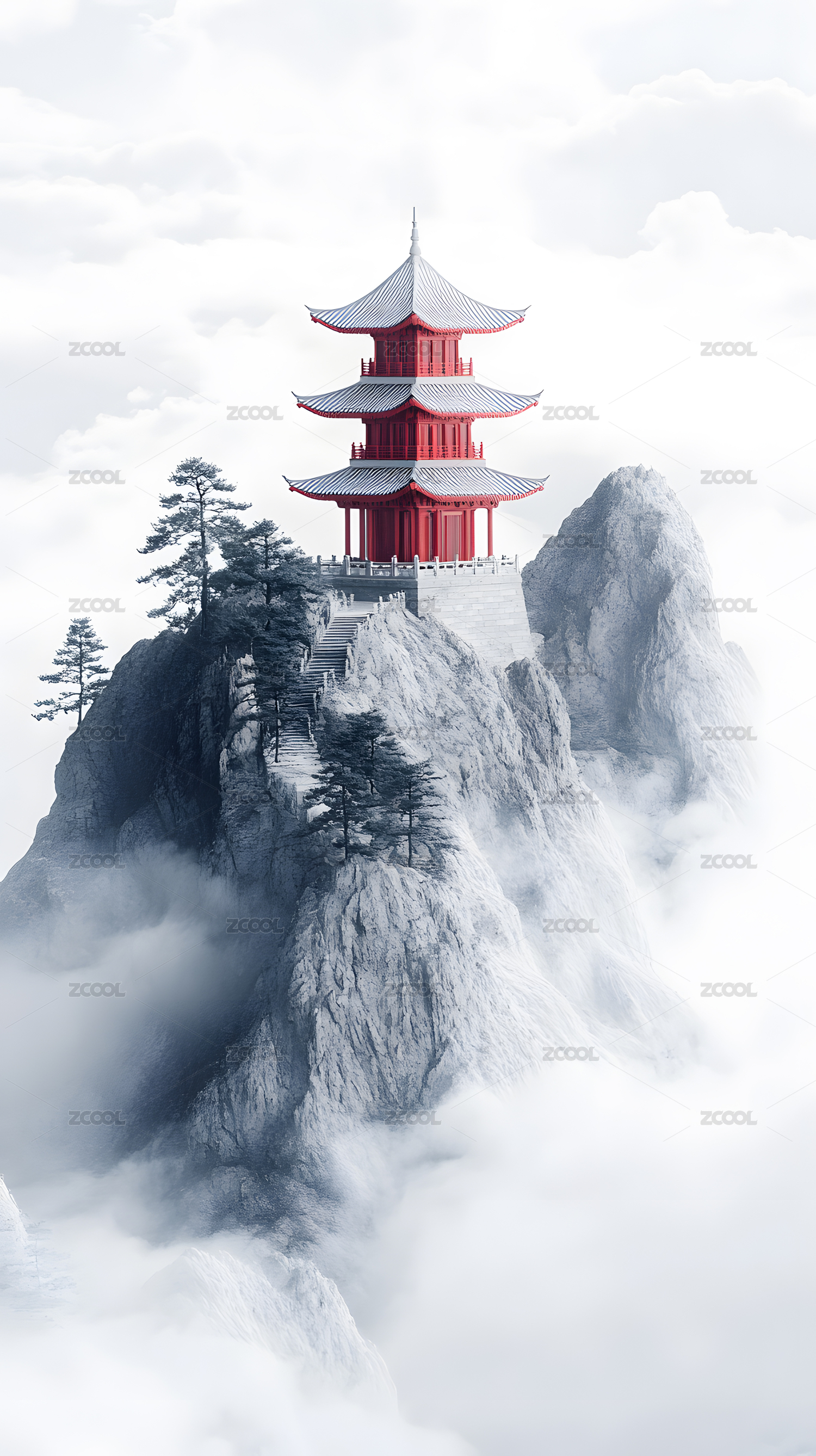 仙境山峦红塔云雾图
