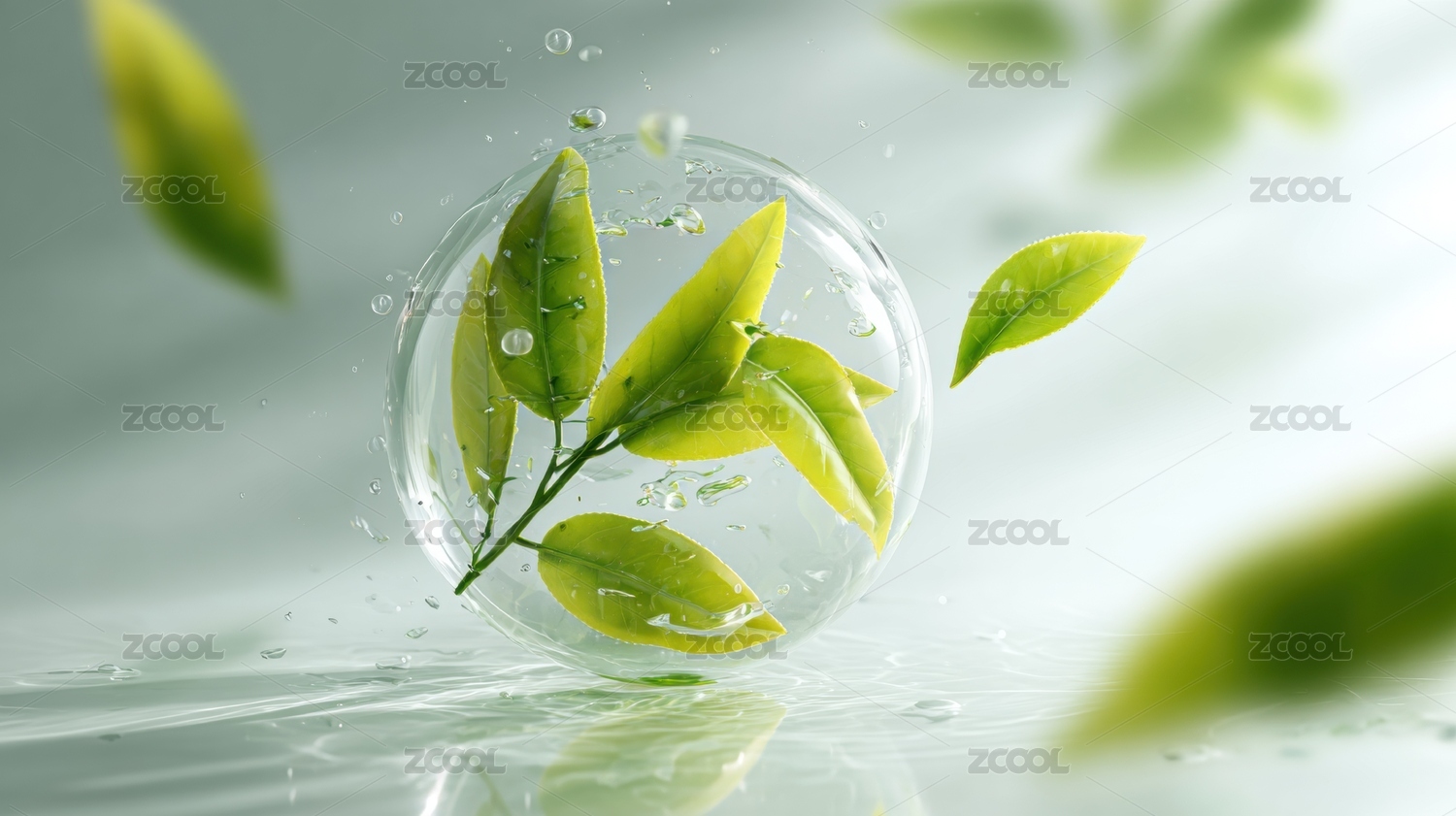 透明球体中的绿叶与水滴