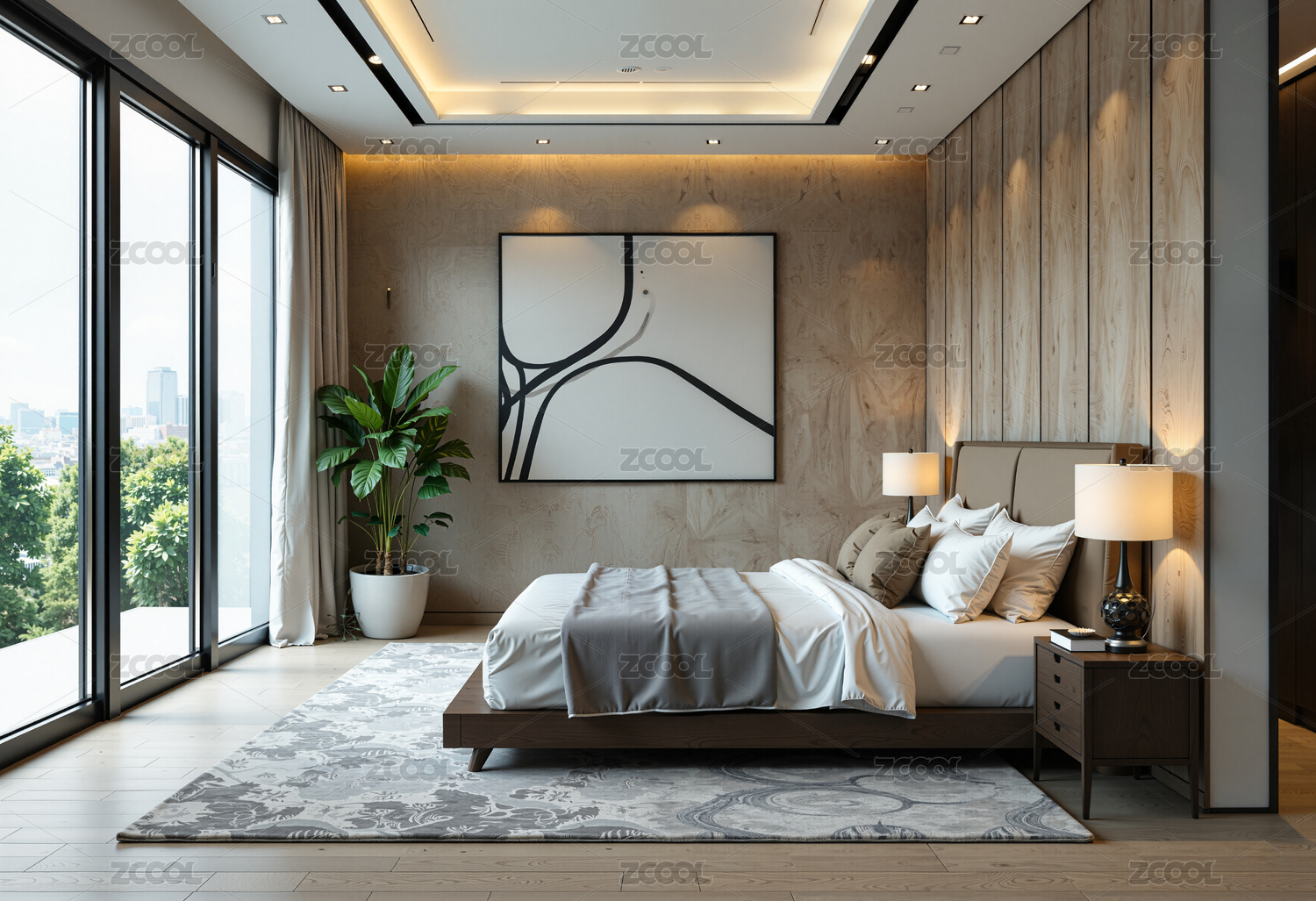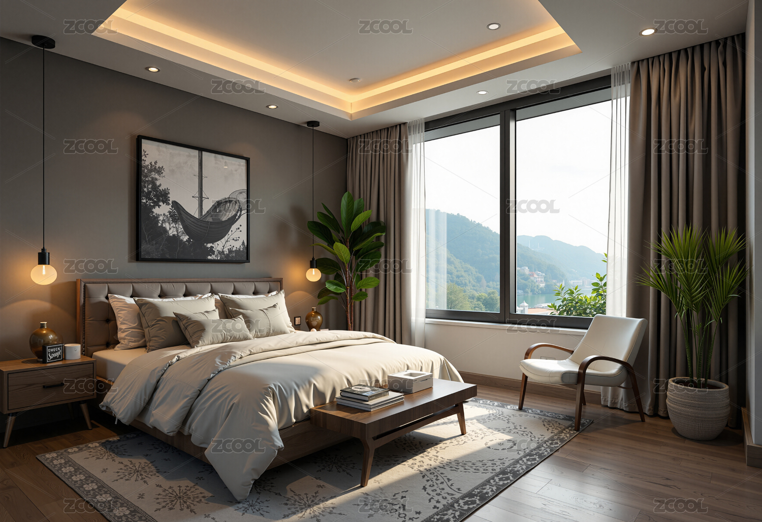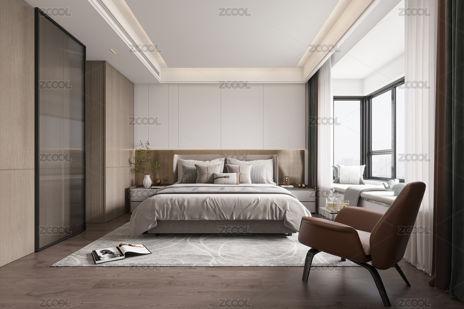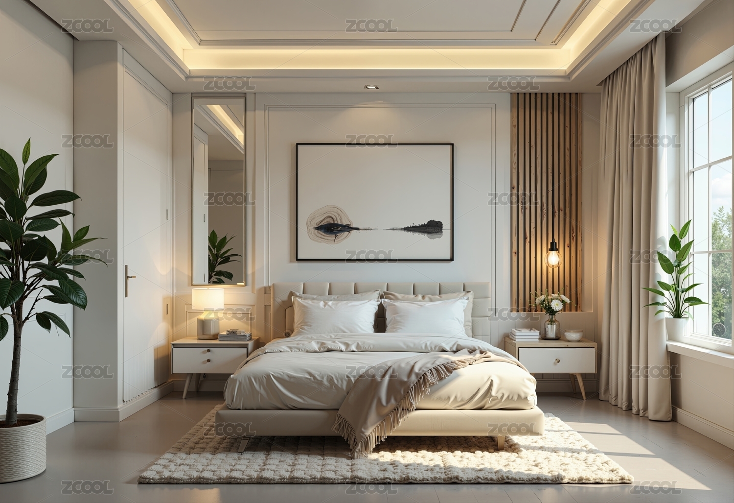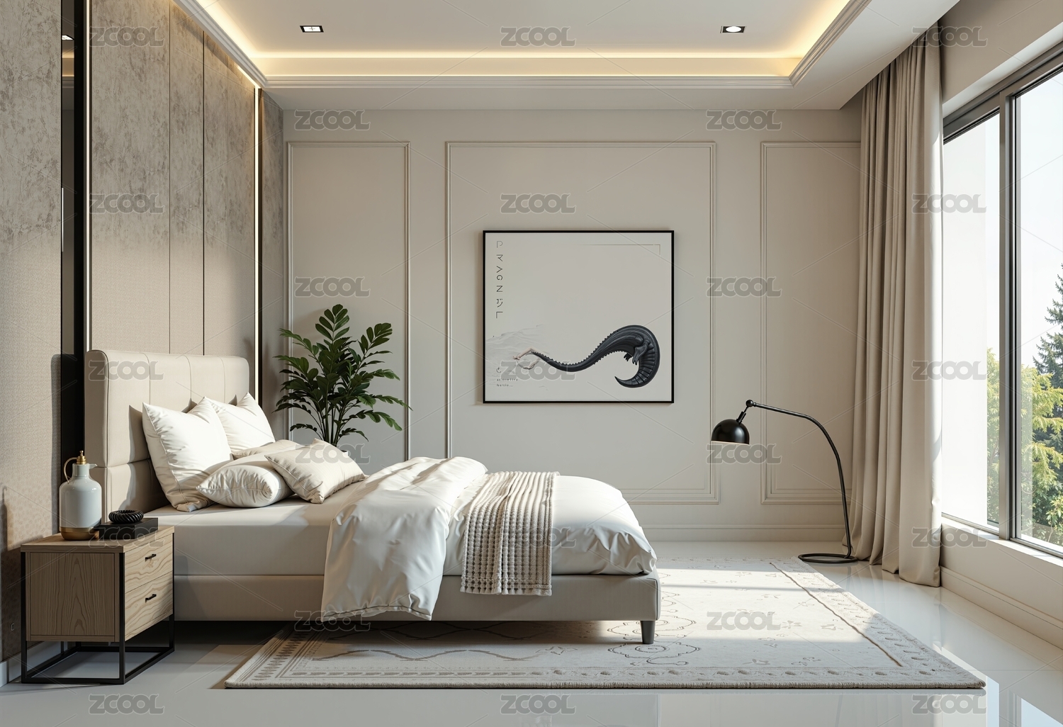卧室,现代,简约,舒适,床,枕头,窗帘,自然光,装饰画,书籍