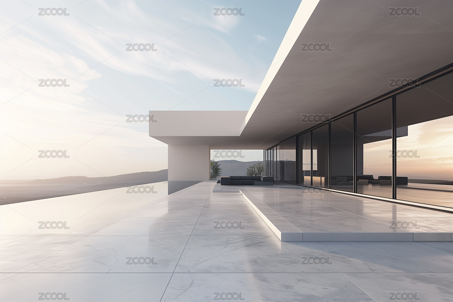 现代别墅露台日落景观