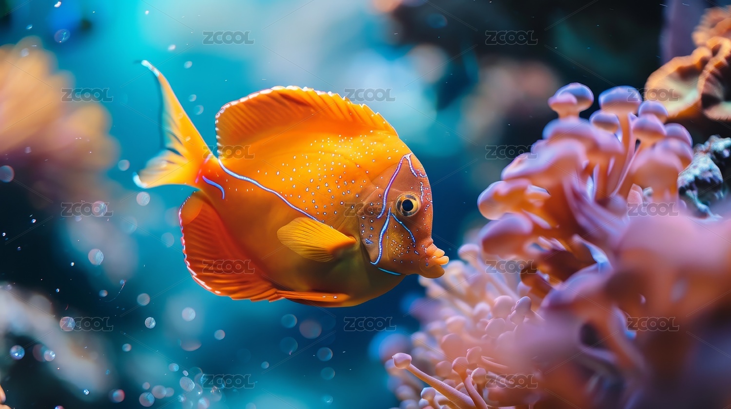 水下黑色背景里游动的红橙色七彩神仙鱼