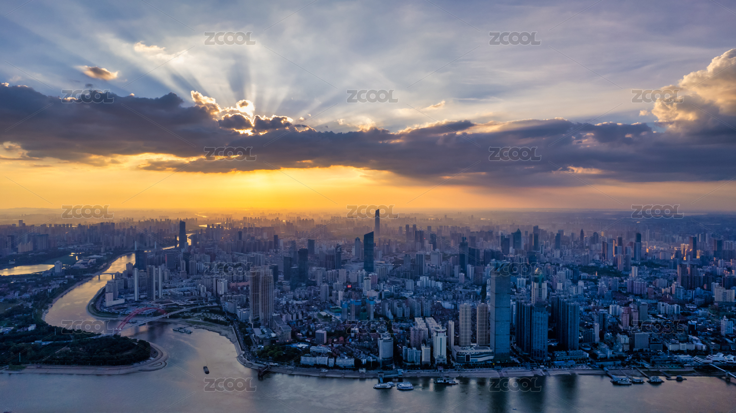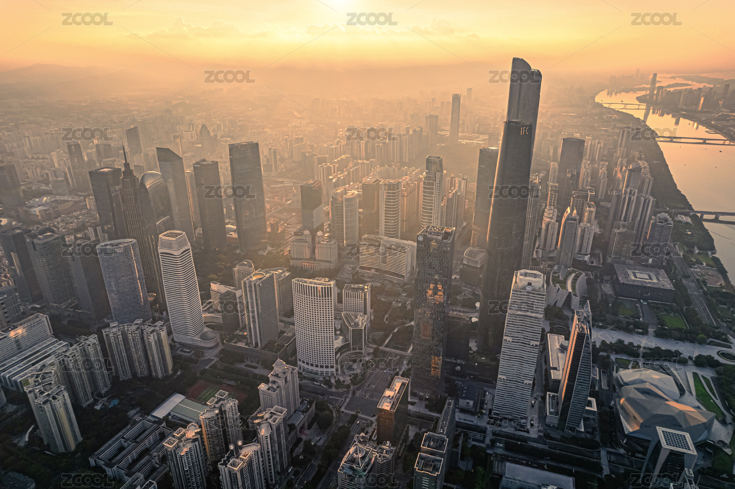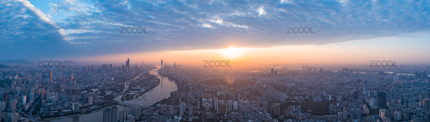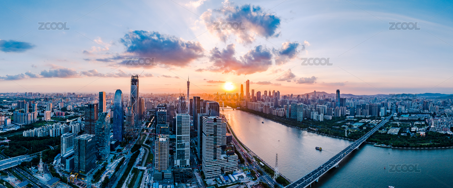广州珠江岸城市建筑群与日出云彩航拍长图