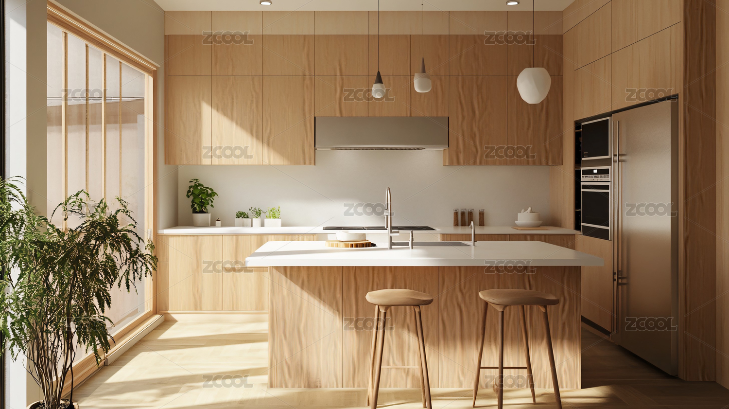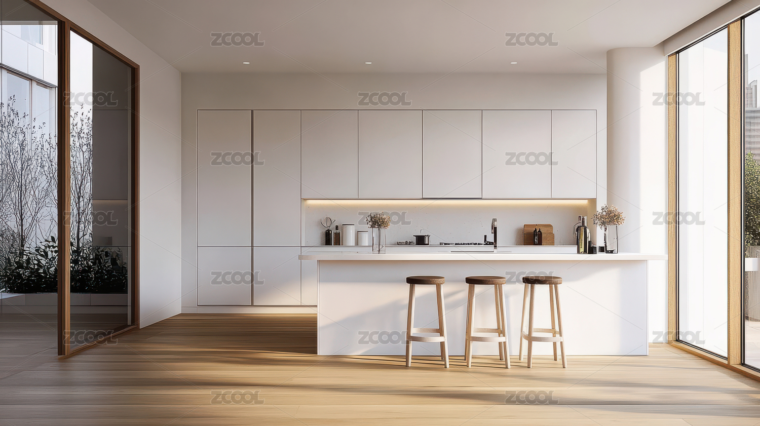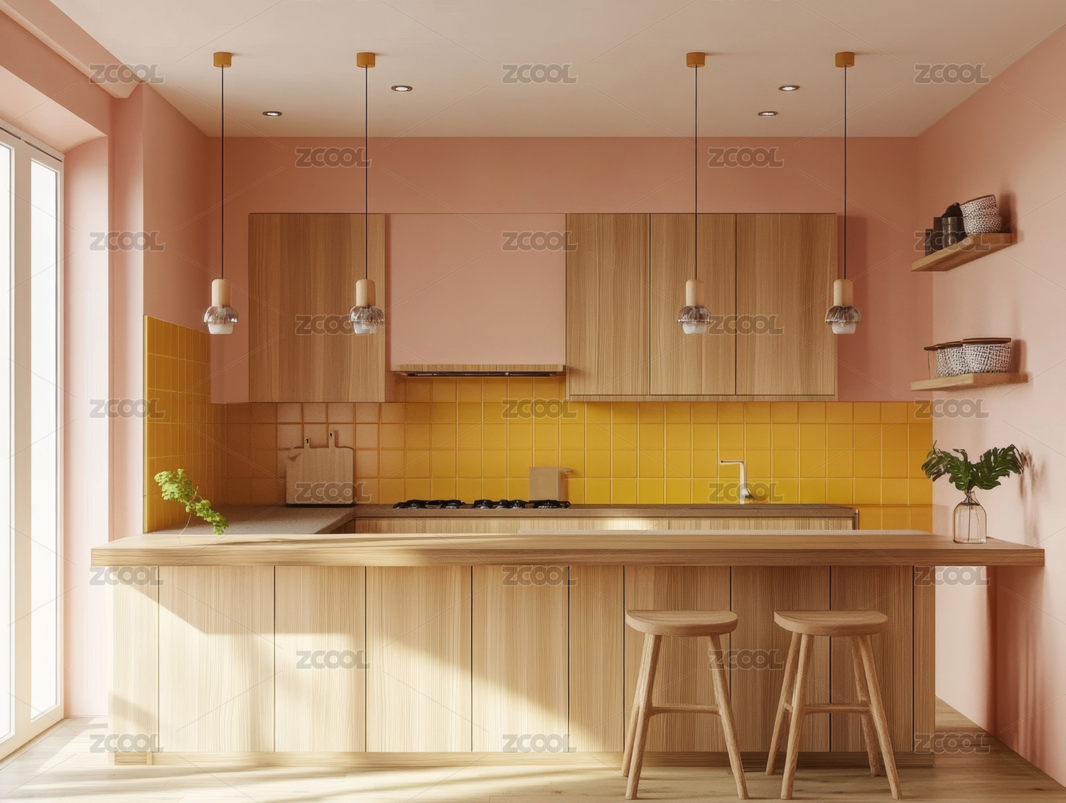 厨房,吧台,吊灯,木质,紫色,墙面,窗户,自然光,简约,风格
