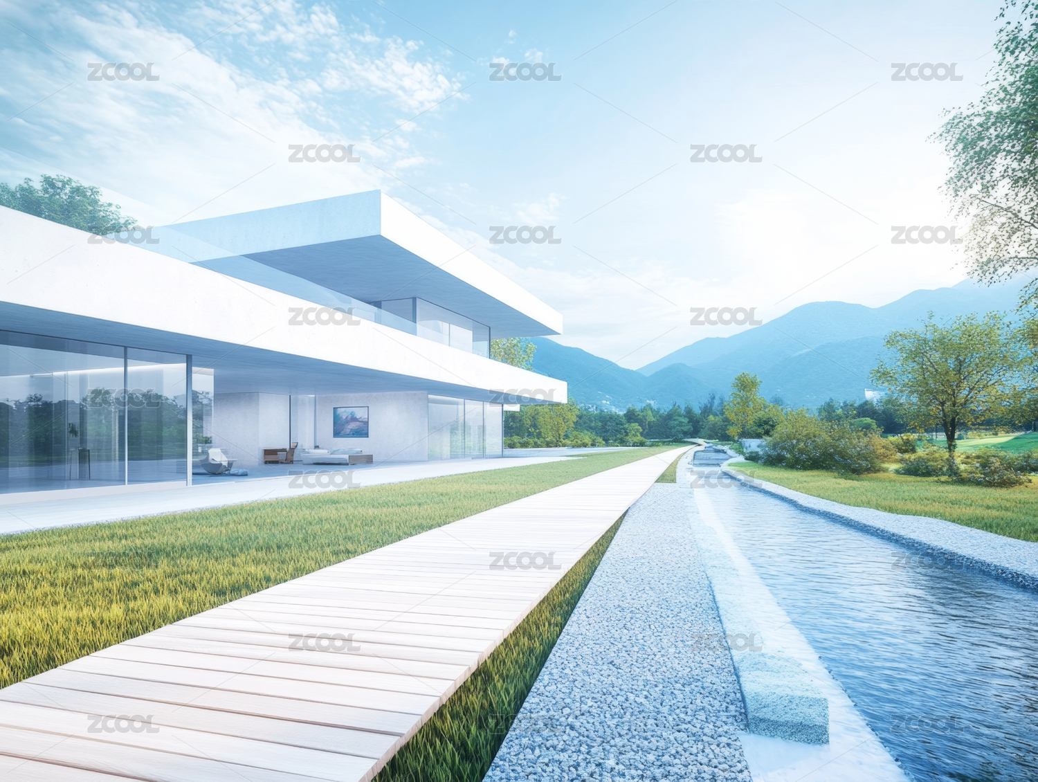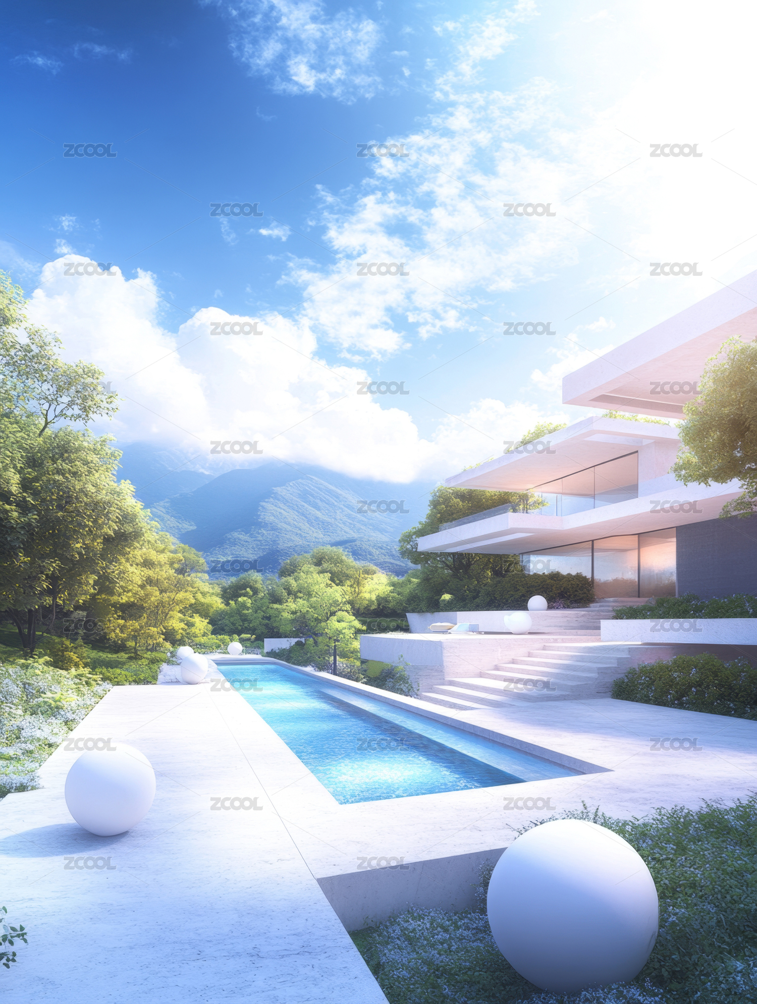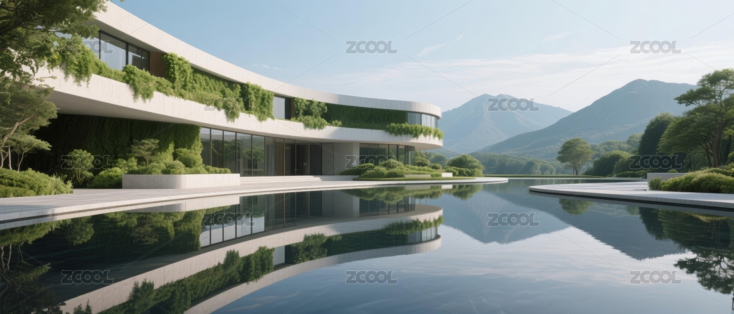现代,建筑,别墅,自然,景观,山脉,反射池,绿树,蓝天,白云