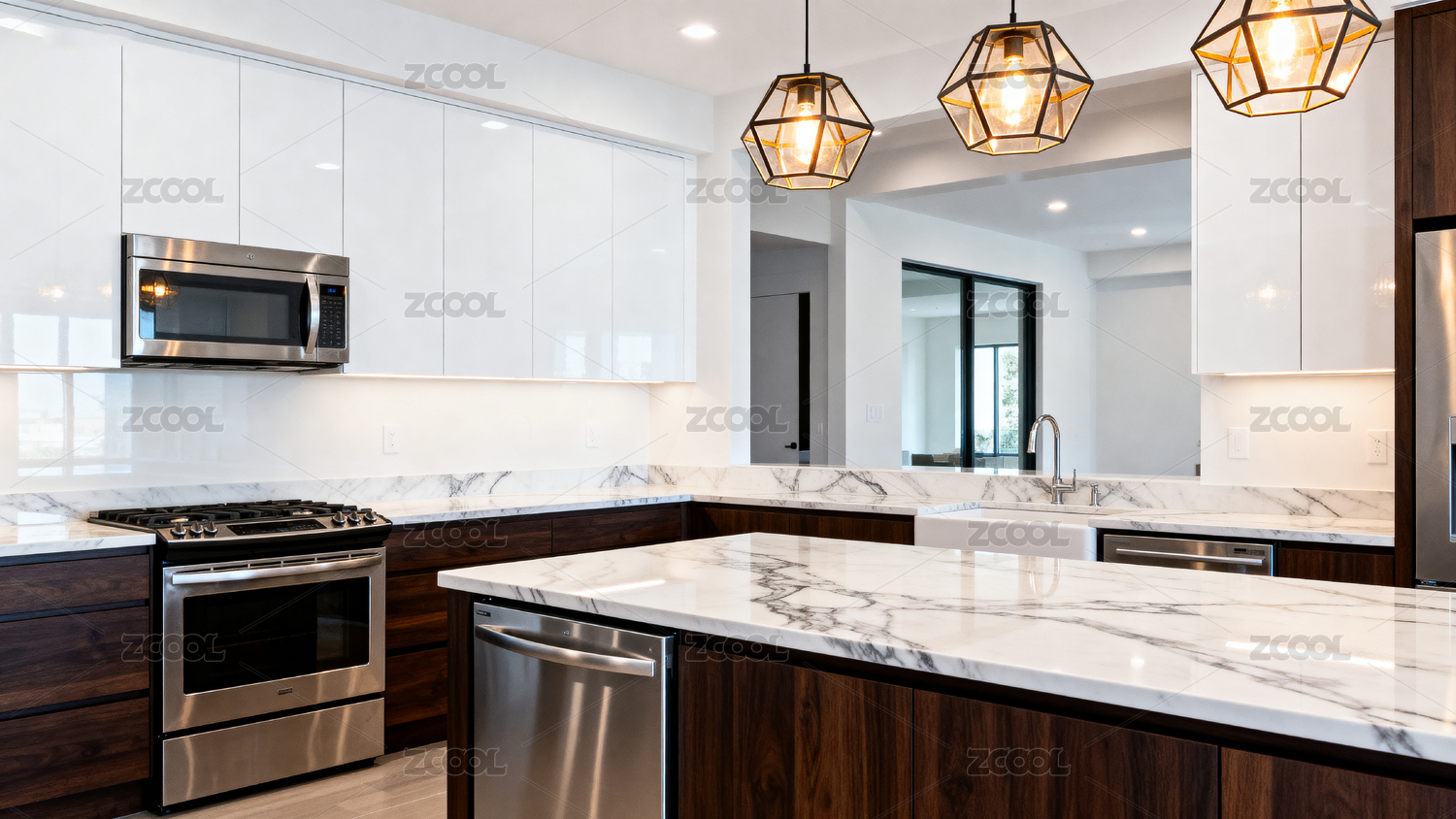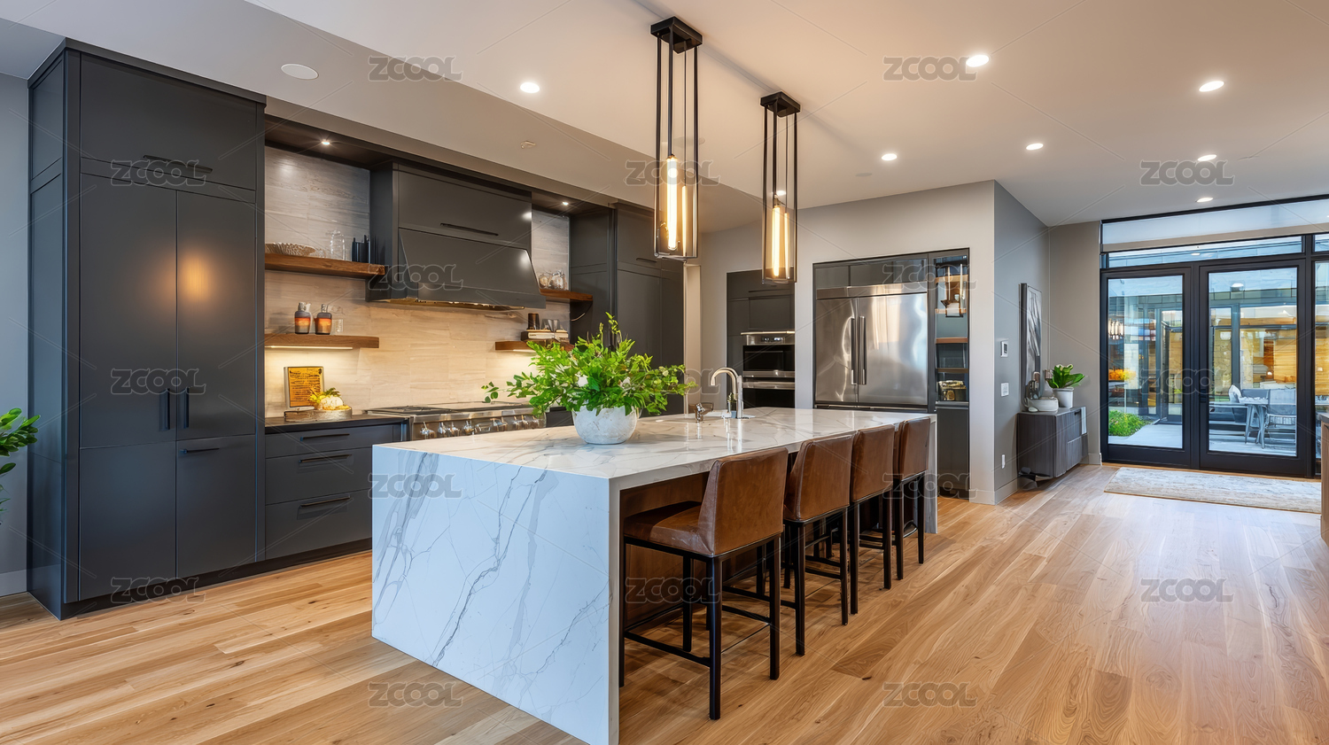 厨房,现代,设计,照明,橱柜,岛台,吊灯,不锈钢冰箱,装饰,植物