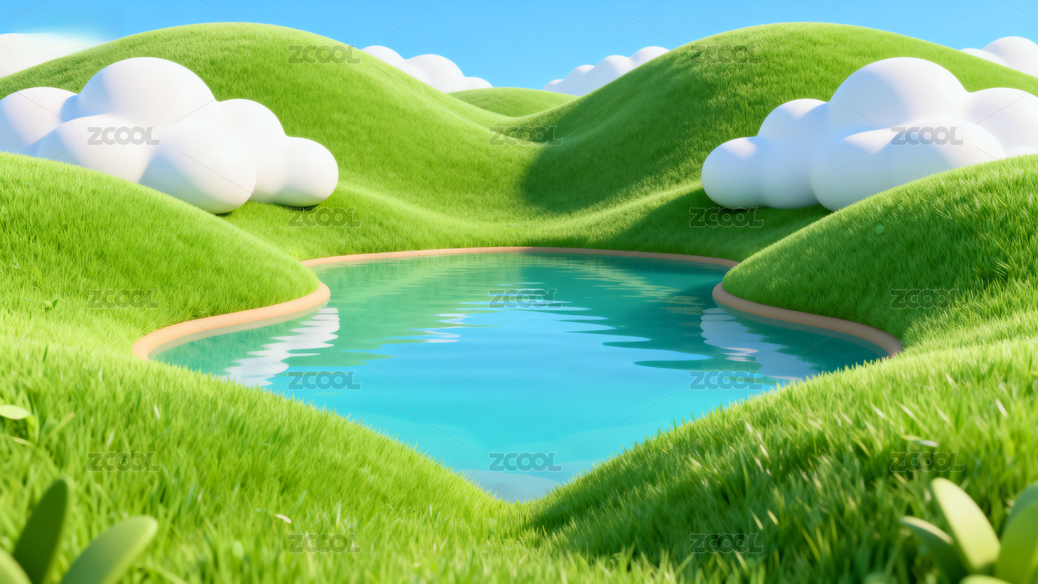 草地,池塘,蓝天,白云,自然,绿色,宁静,夏日