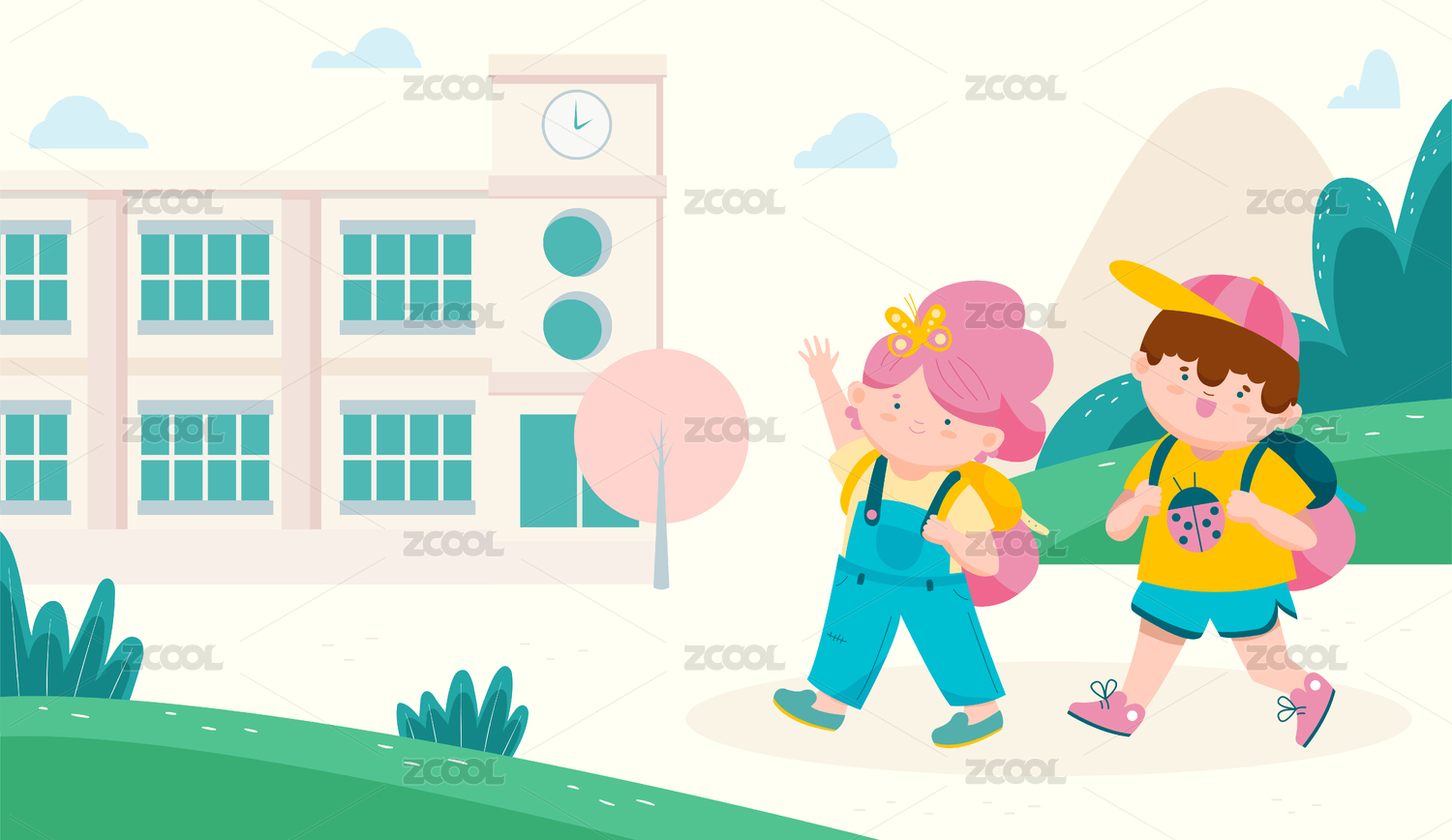 两个小朋友一起去学校上学扁平矢量插画