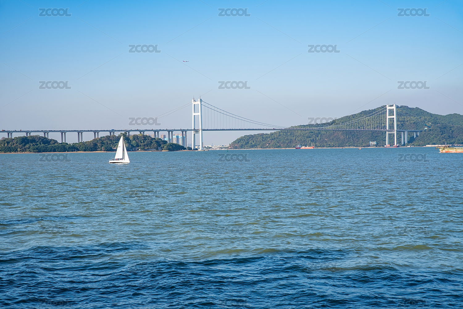 中国广东省珠江口海面上帆船和虎门大桥远景