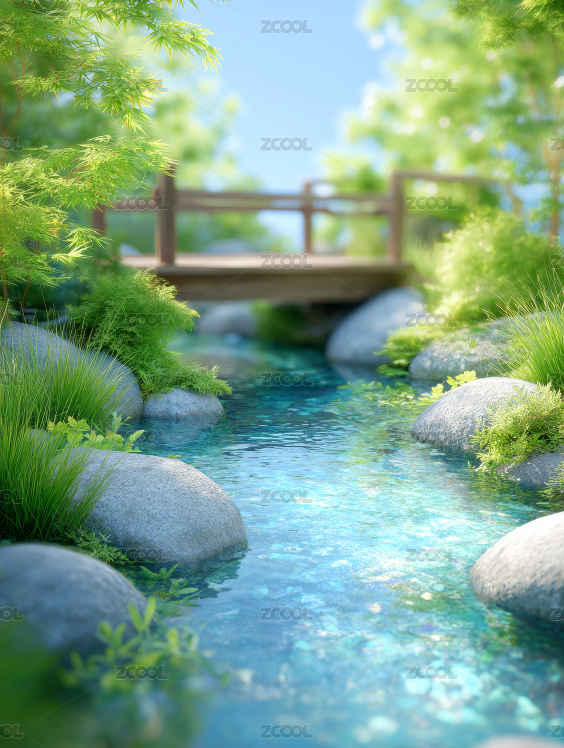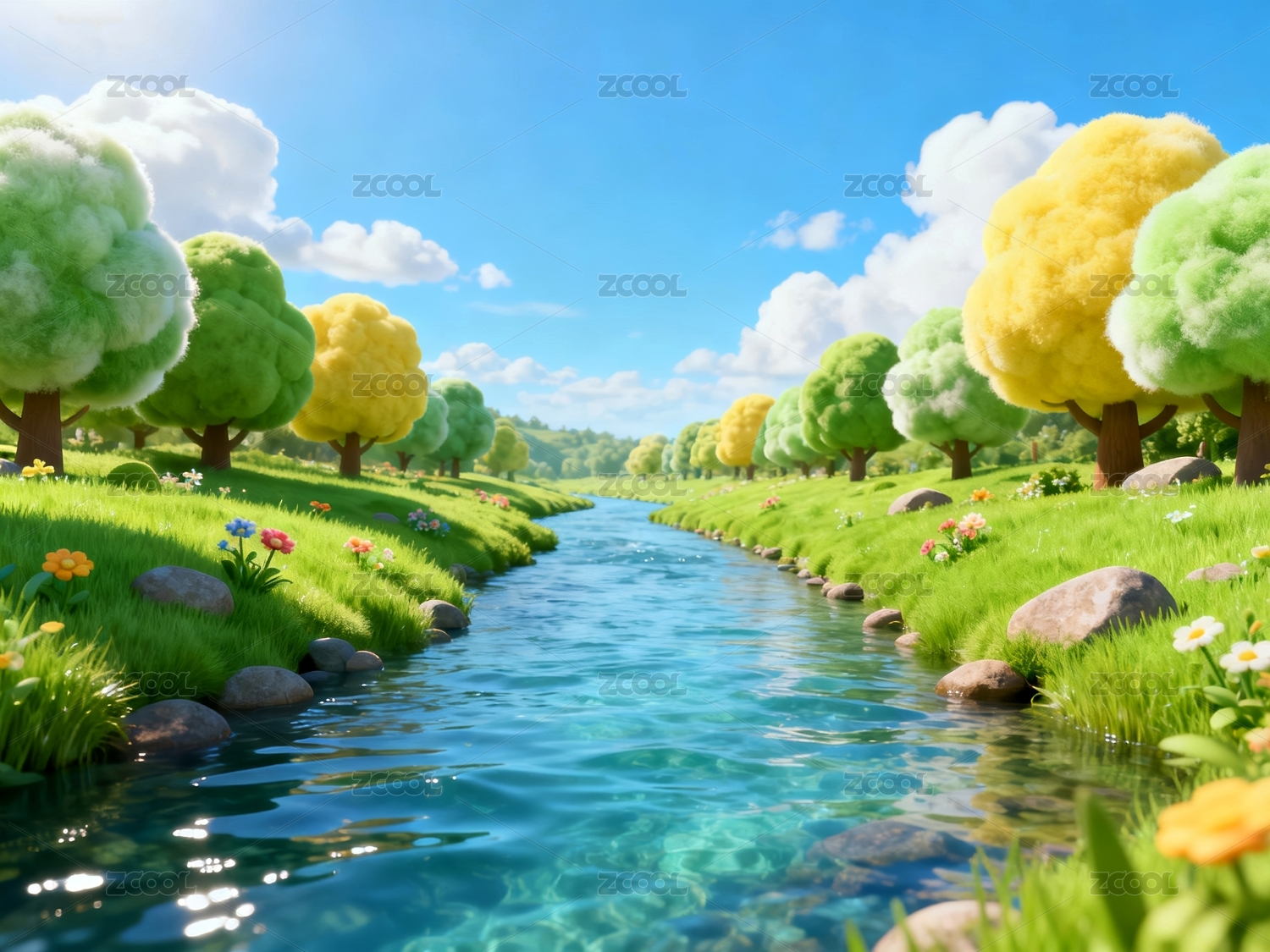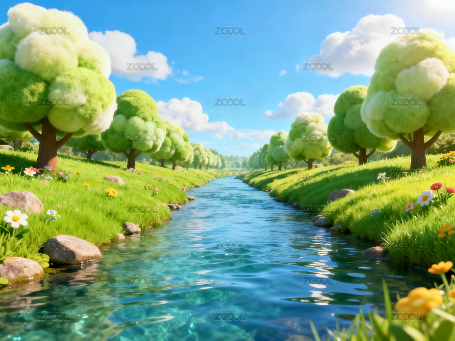 3d,插画,春天,柳树,随风,轻摆,垂丝,溪水,绿叶,柳枝