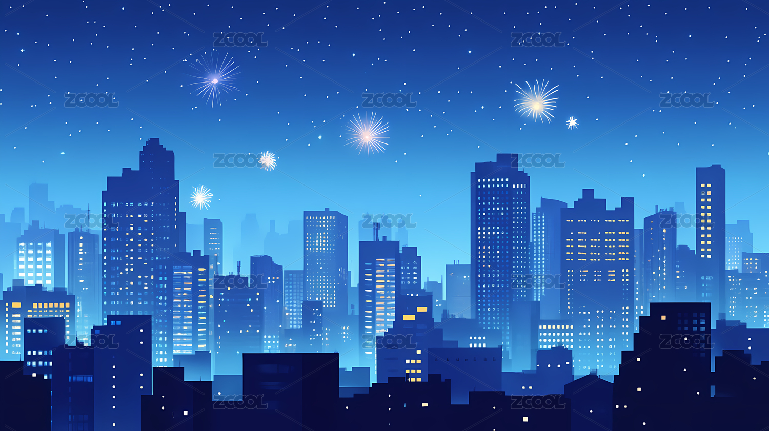 城市高楼建筑群烟花夜景插画